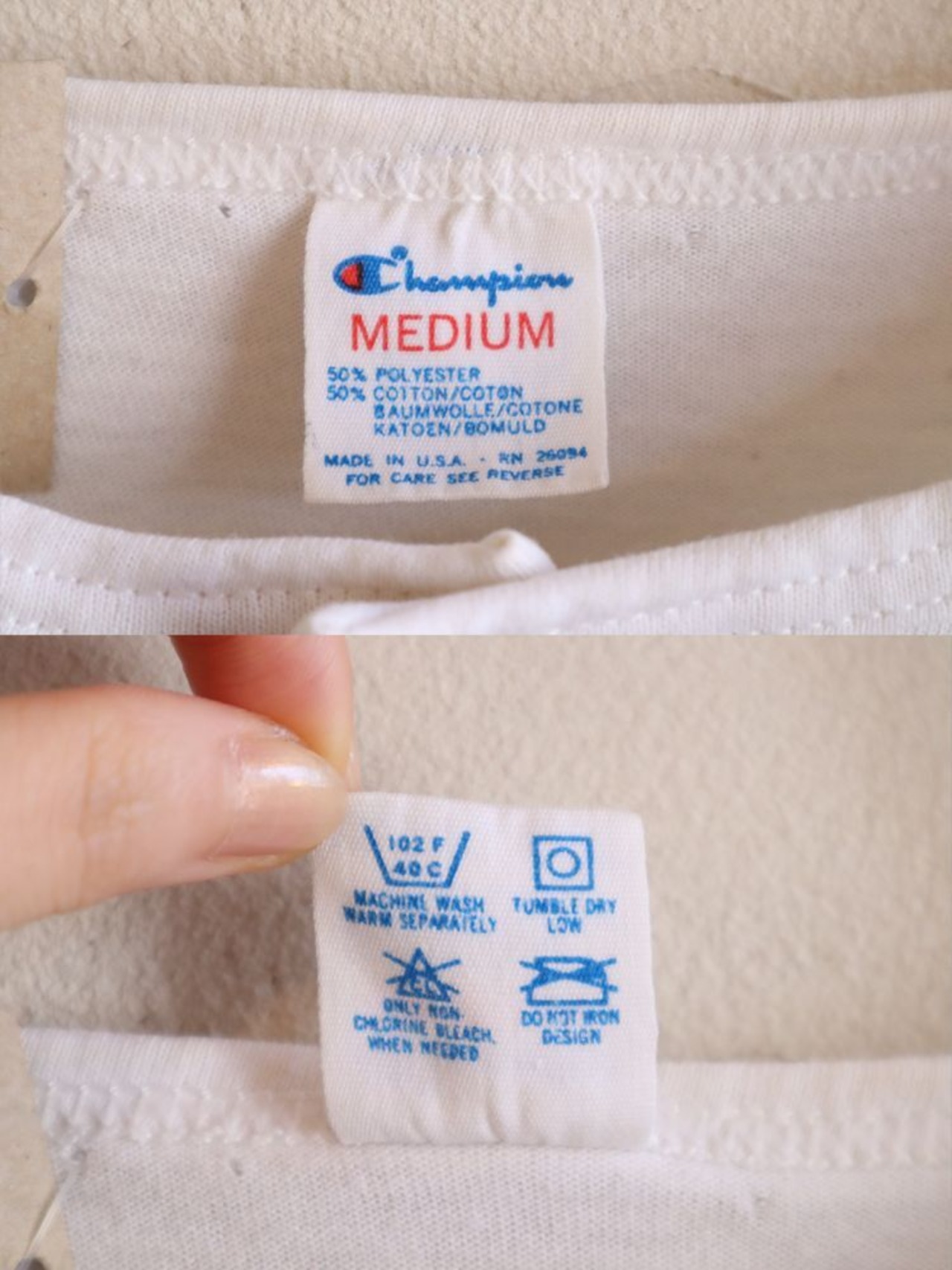 80s ”Champion” white × red logo print baseball tee [l-125]