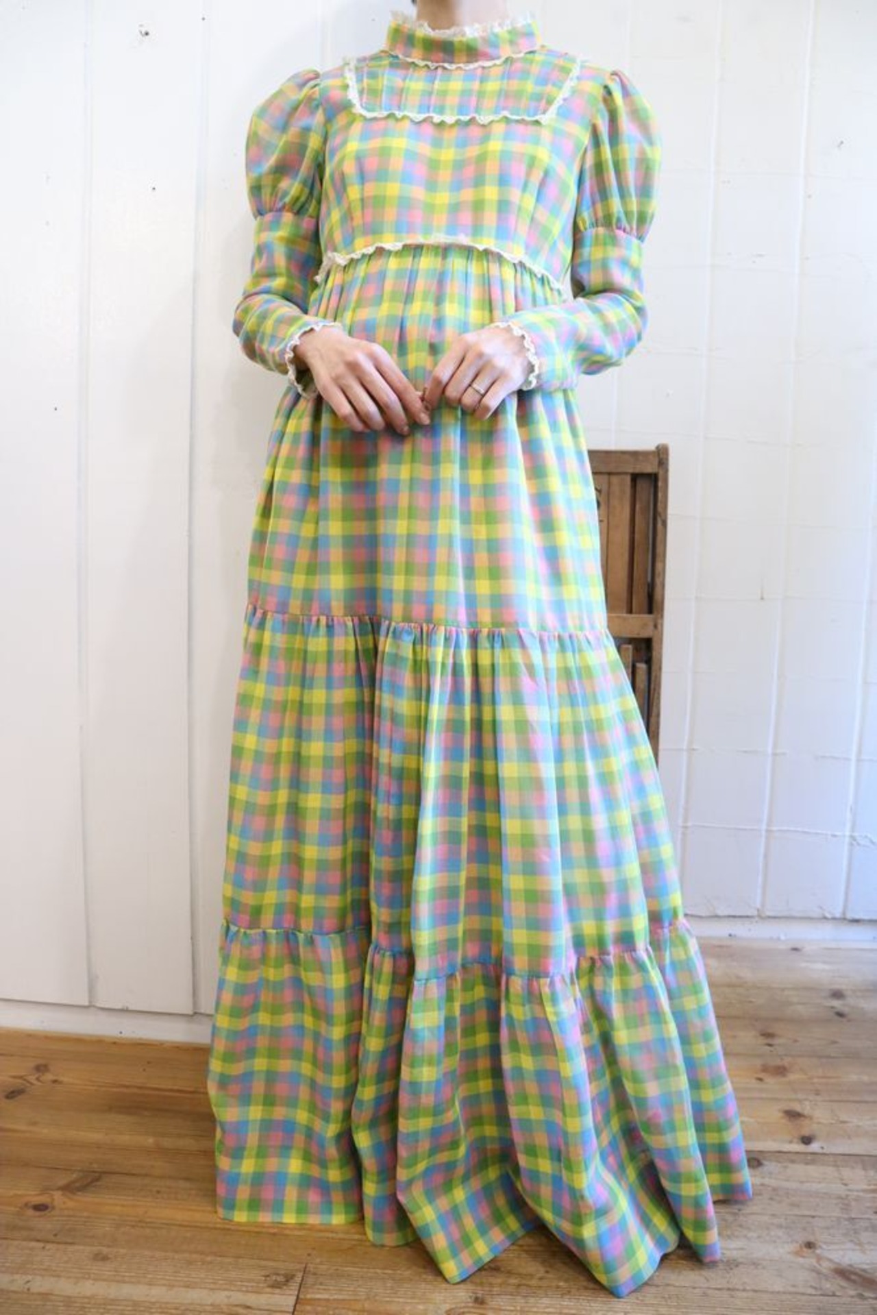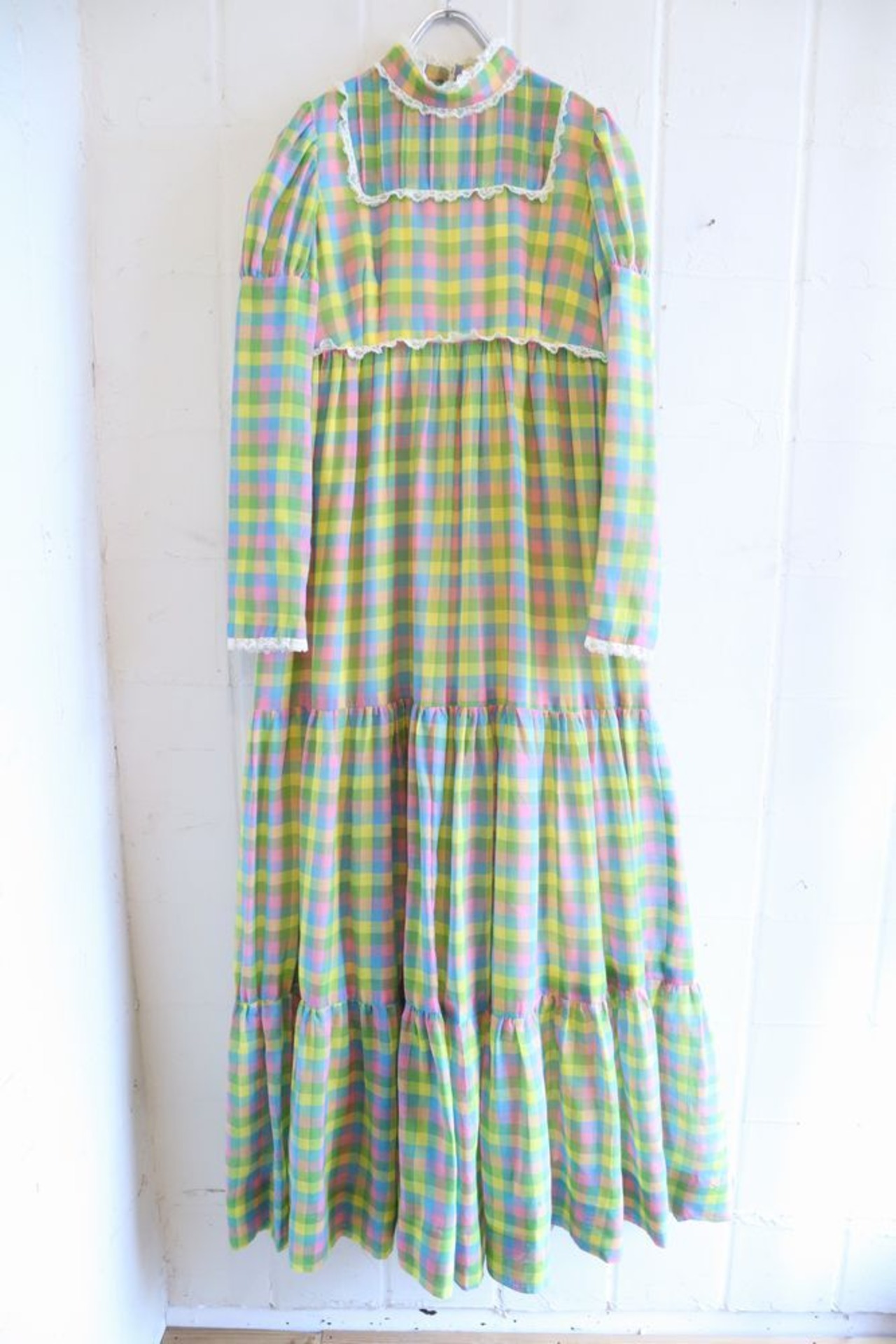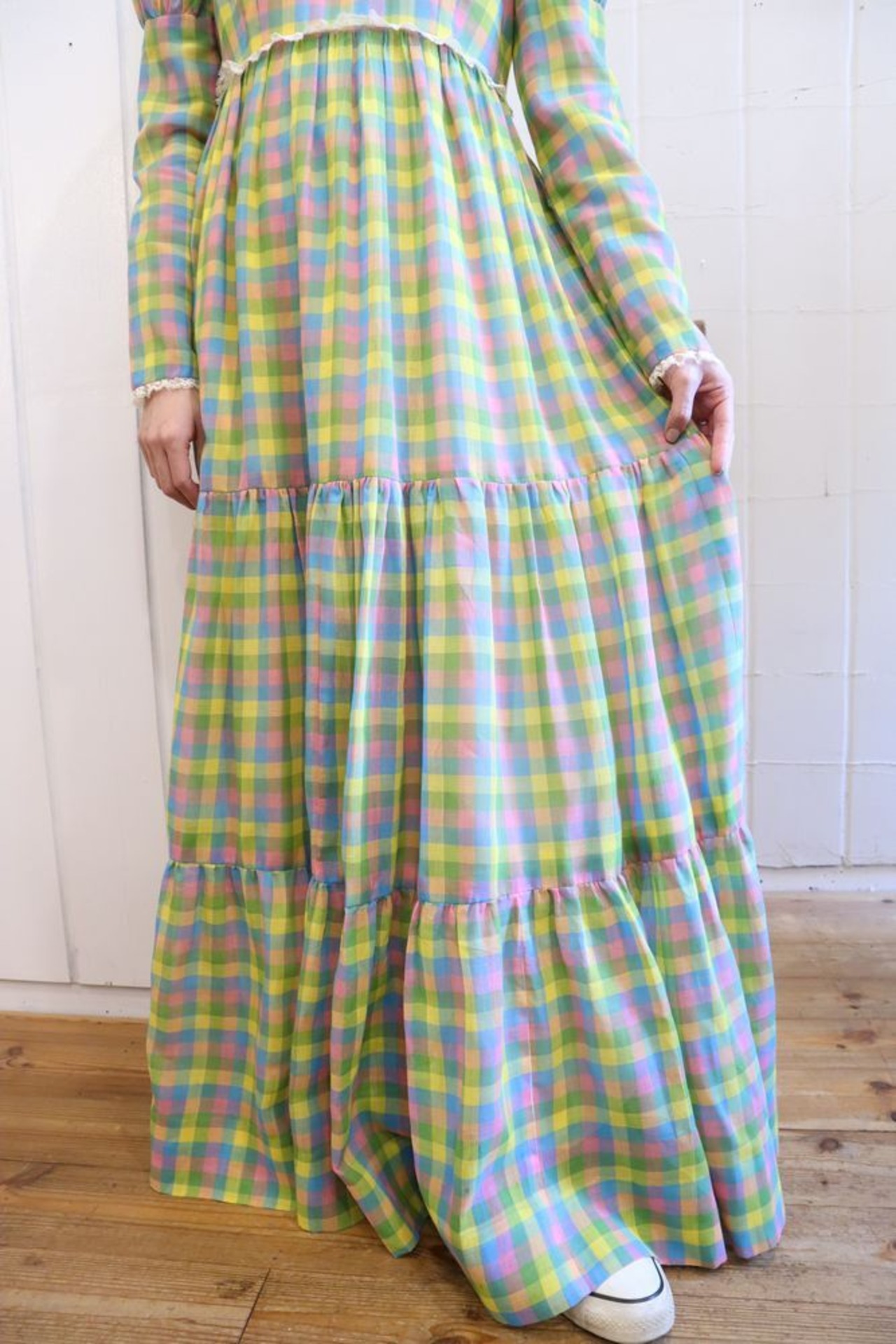70s yellow-green×colorful plaid pattern tiered long dress [l-166]