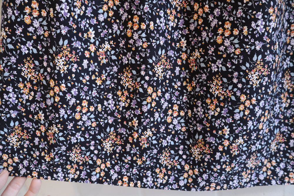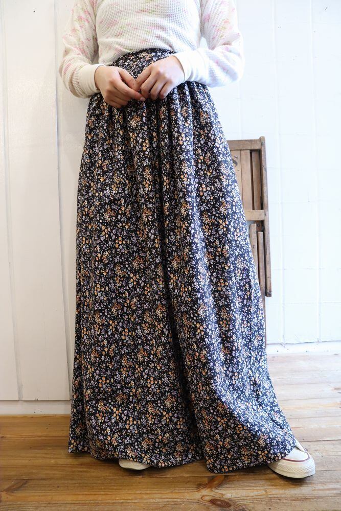 オレンジやくすみブルーの小花柄が素敵なスカートです。