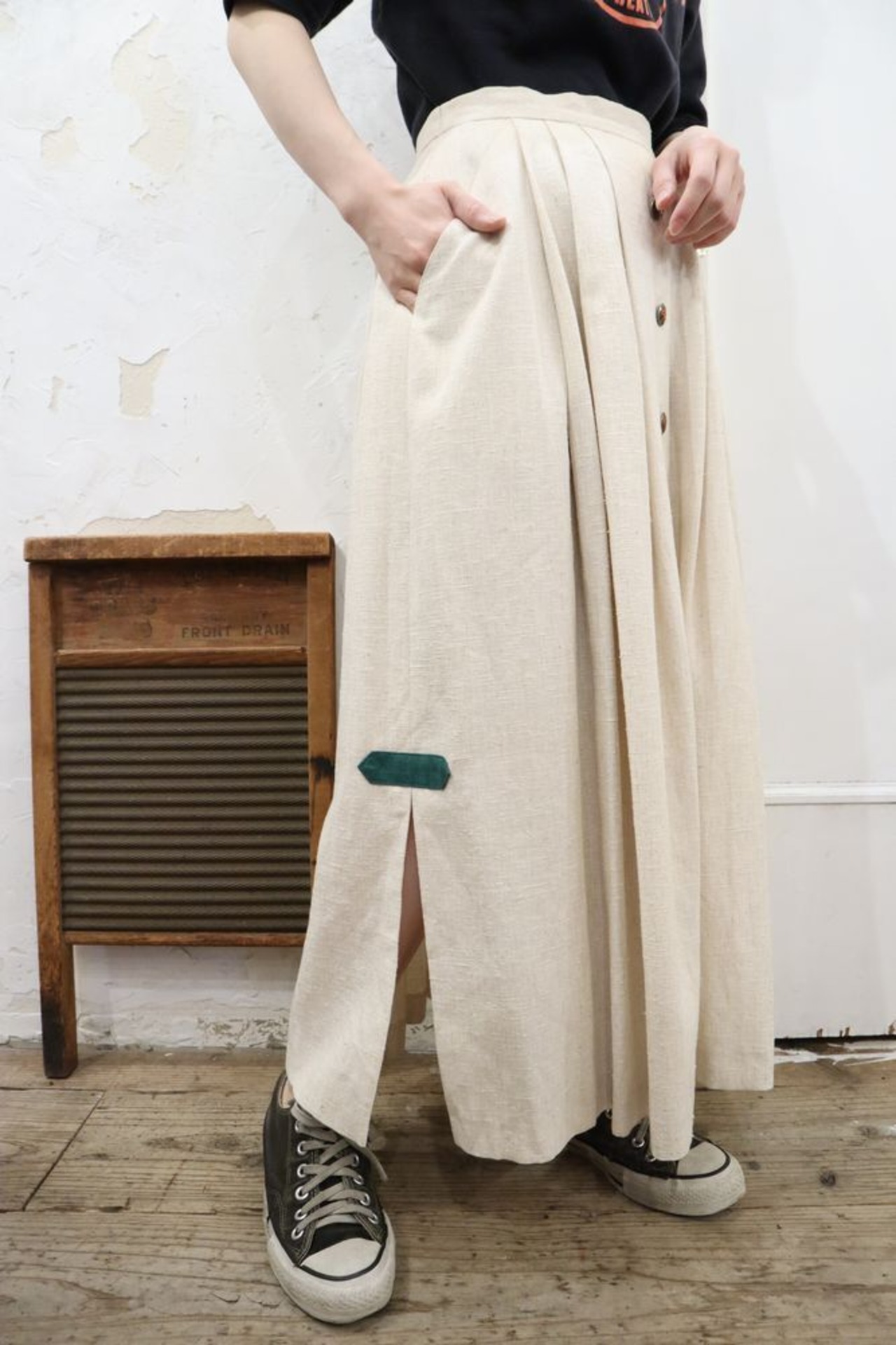 ポケット付き、裾のサイドにスリットが入っております。
