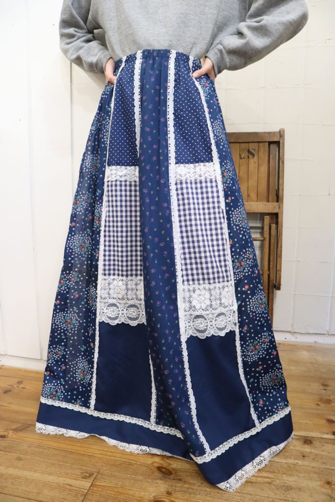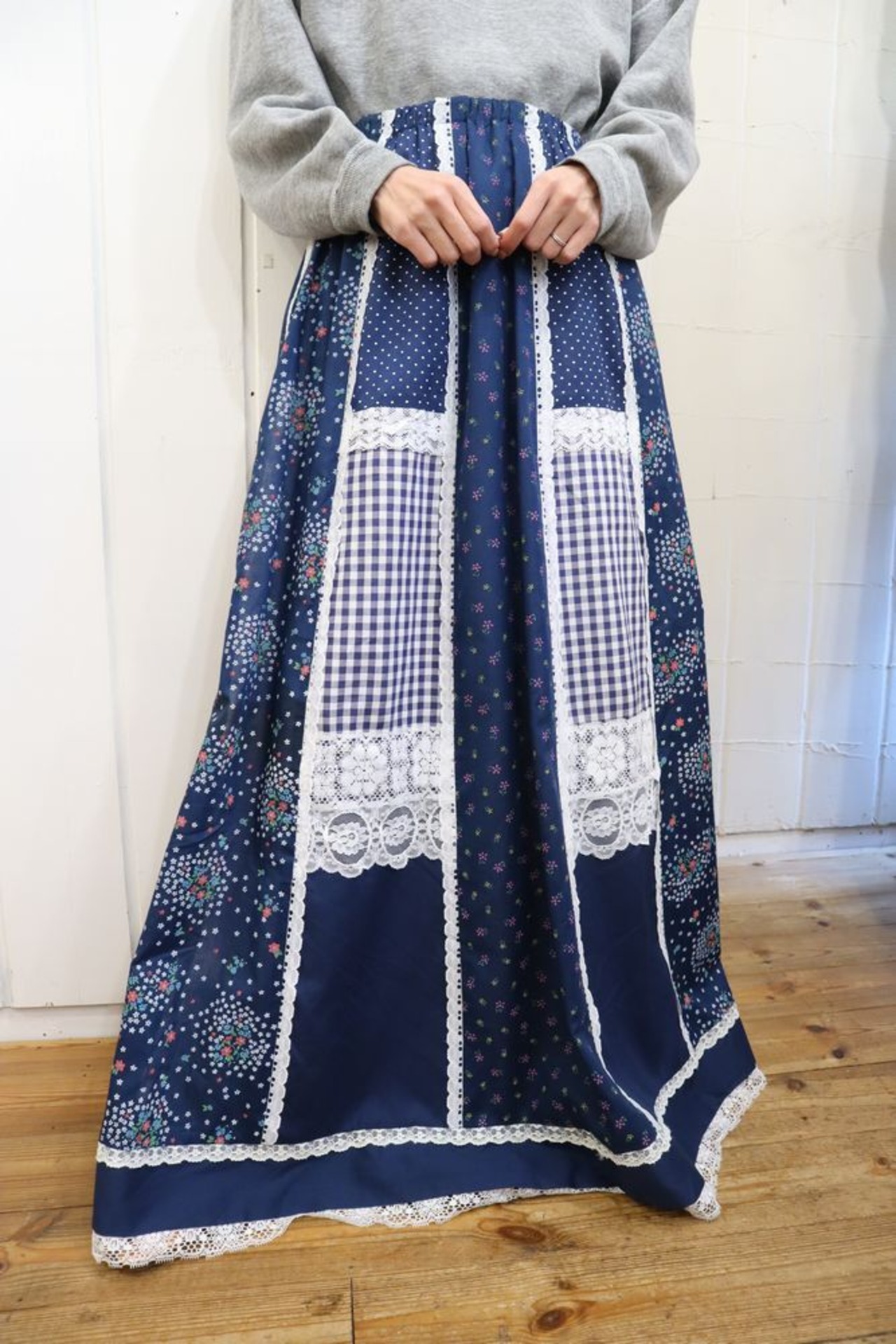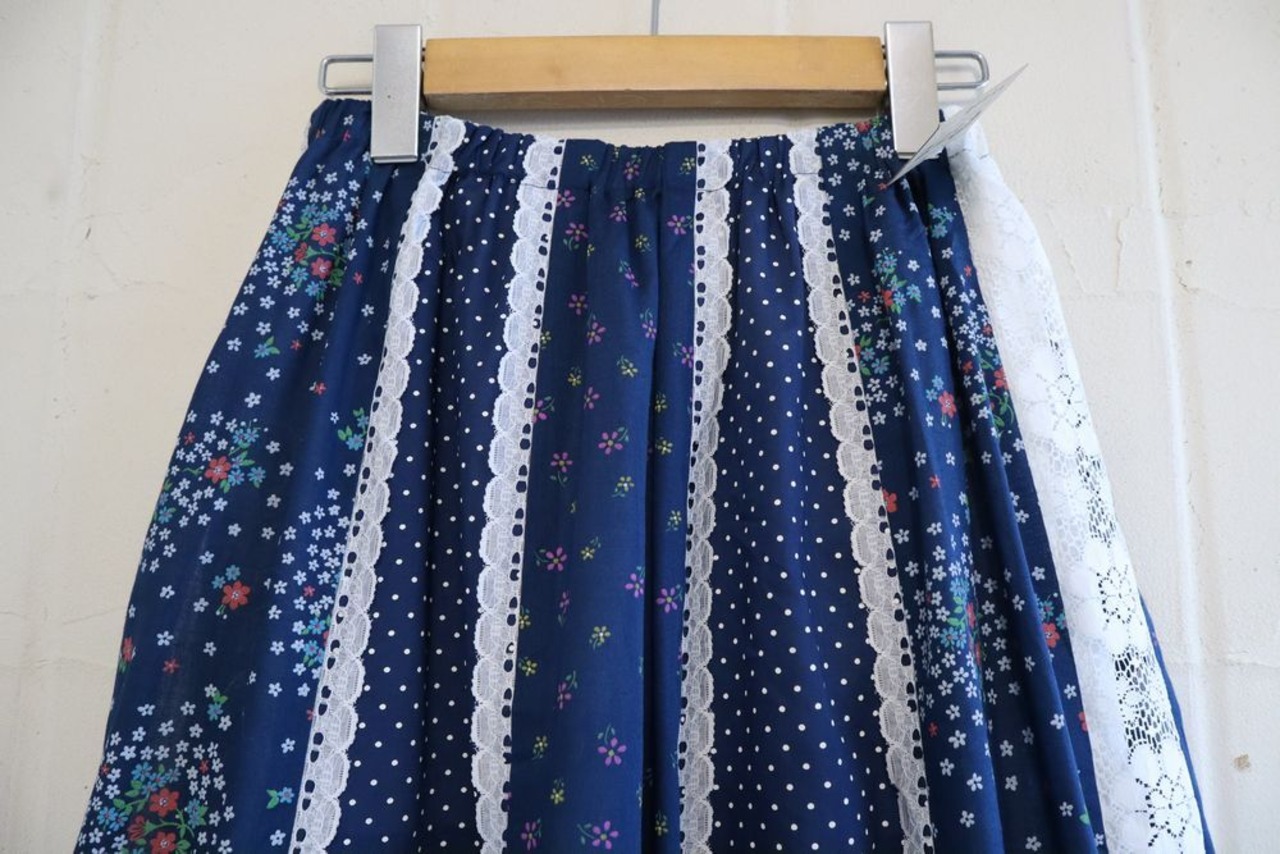 70s navy × white flower & plaid lace patchwork skirt [l-194]