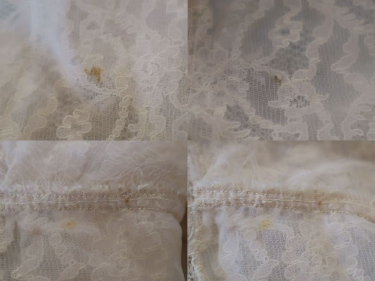 レースに一部小さな破れや点ほどのシミ、いくつか色移りの様なピンクの汚れ、小さな薄汚れがございますが、あまり気にならないかと思われます。