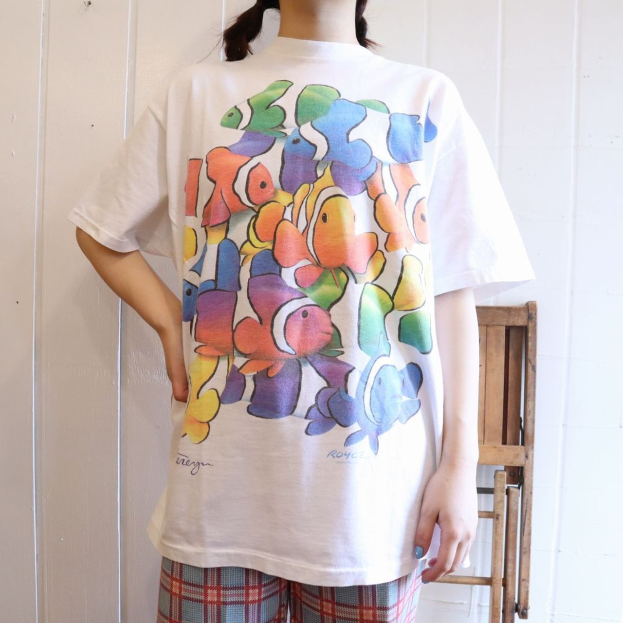 ”Hanes” white × colorful fish print T-shirt [k-239]