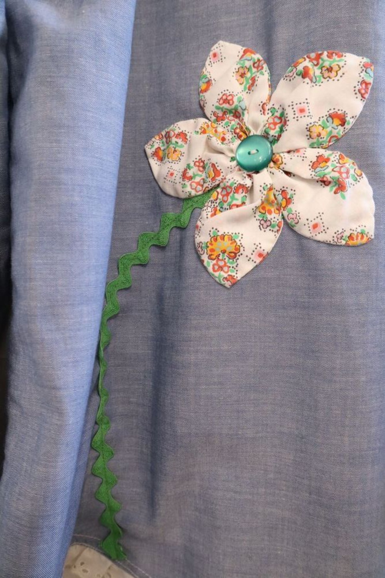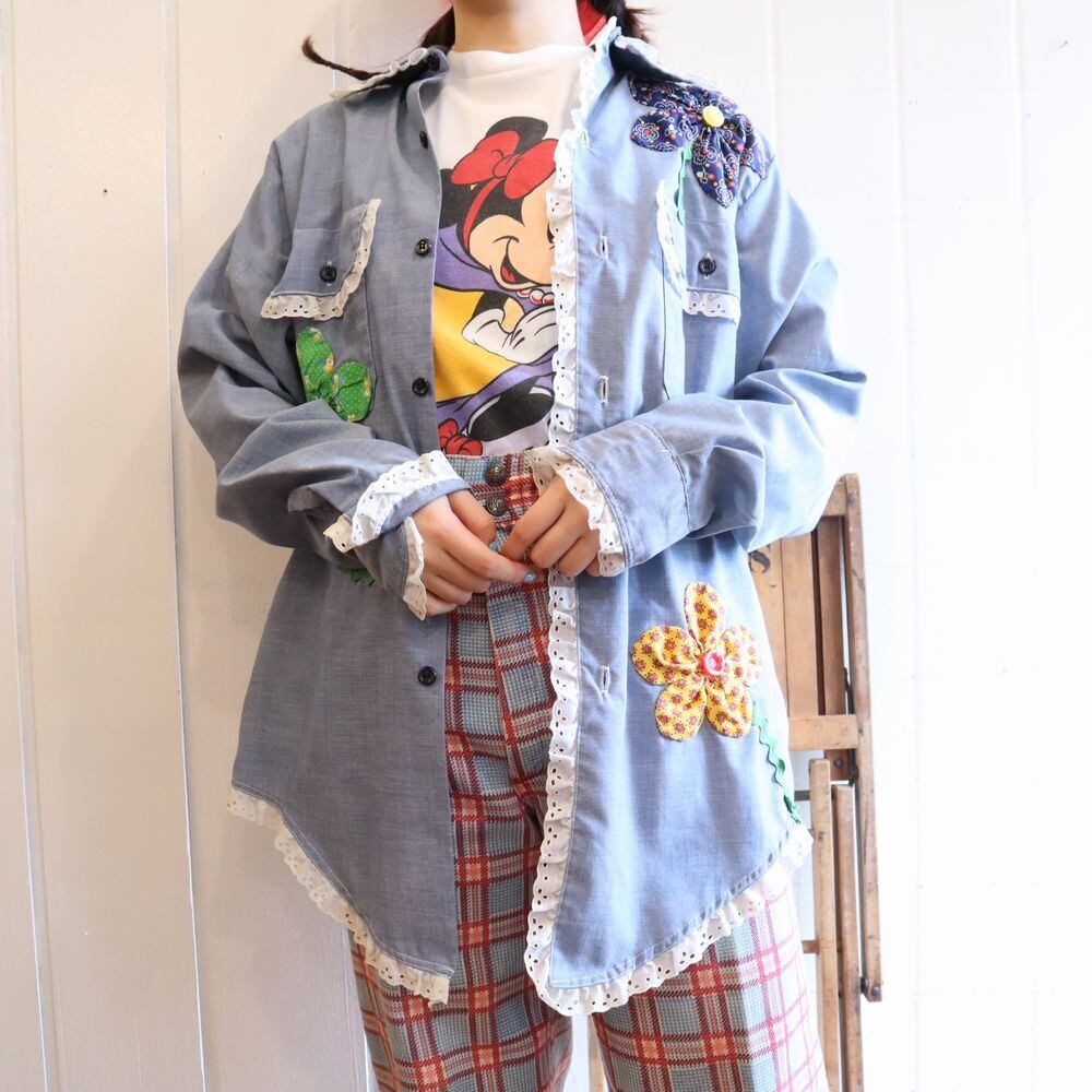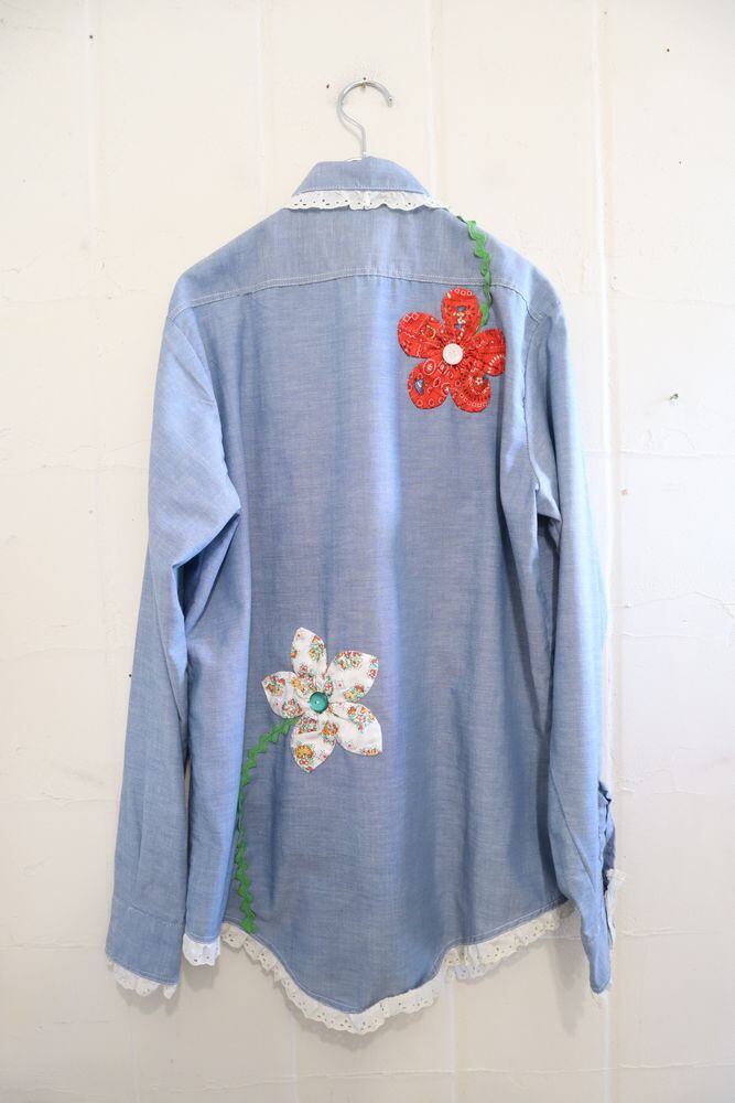 ”Sears” light-blue flower patch & lace chambray shirt [l-243]
