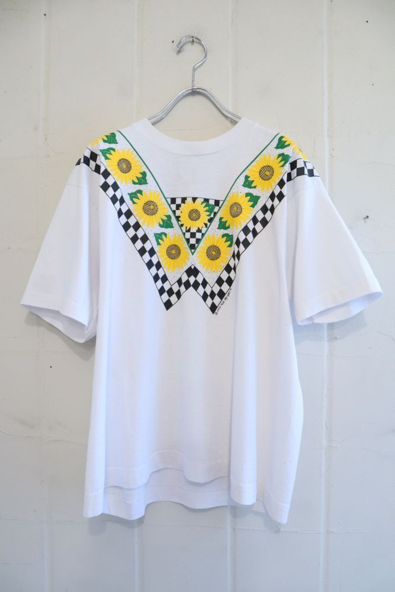 white×yellow×black sun flower & plaid print T-shirt [l-250]
