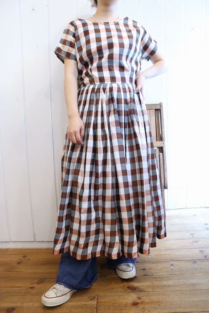 淡いサーモンピンクの様なお色味や、淡いブラックのようなお色味の絶妙なカラーリングが可愛い50sドレスです。