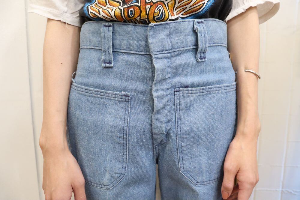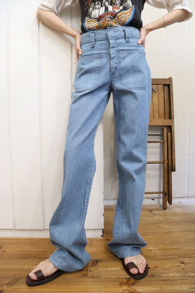 70s ”Wrangler” light-blue front pocket flare denim pants [l-288]