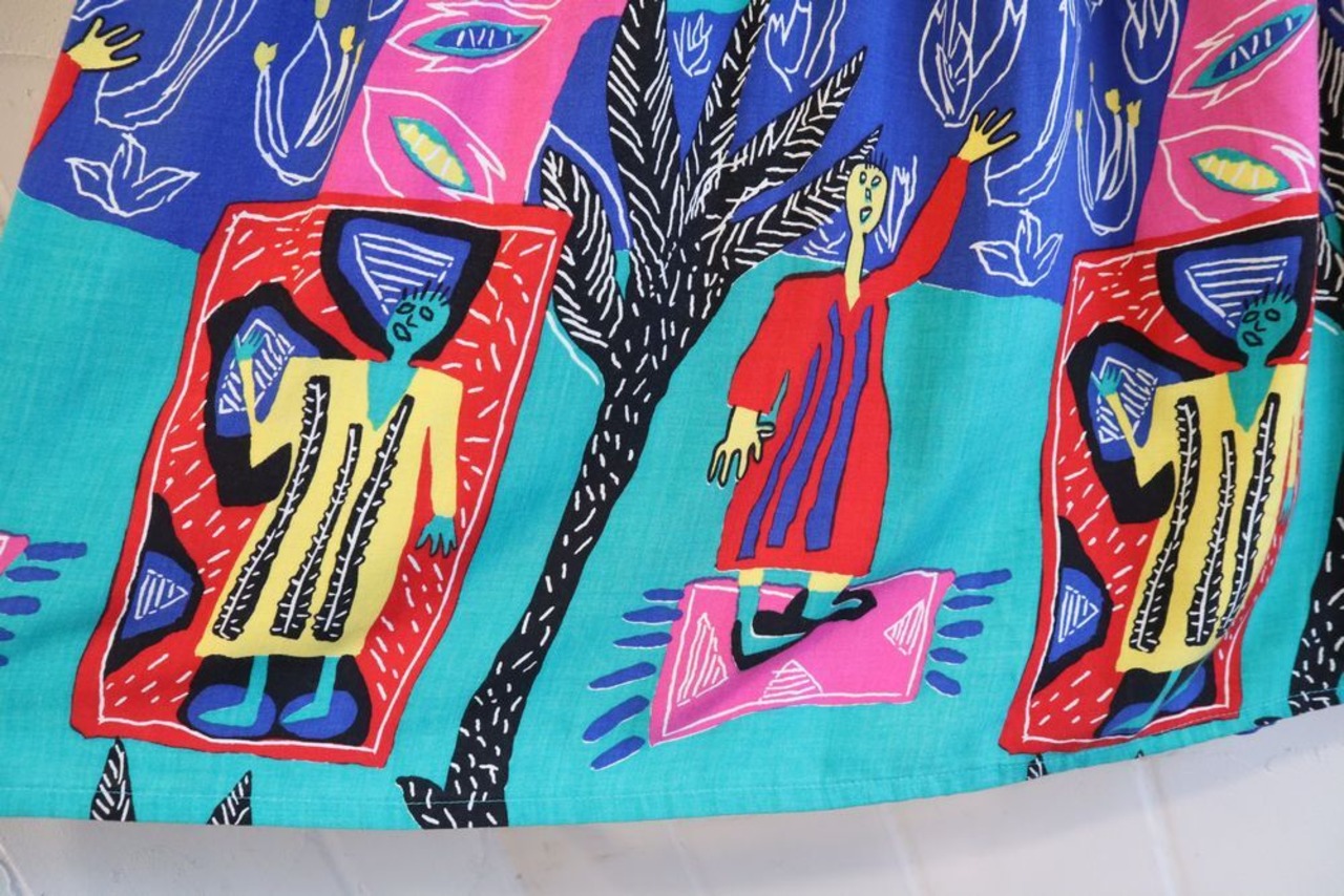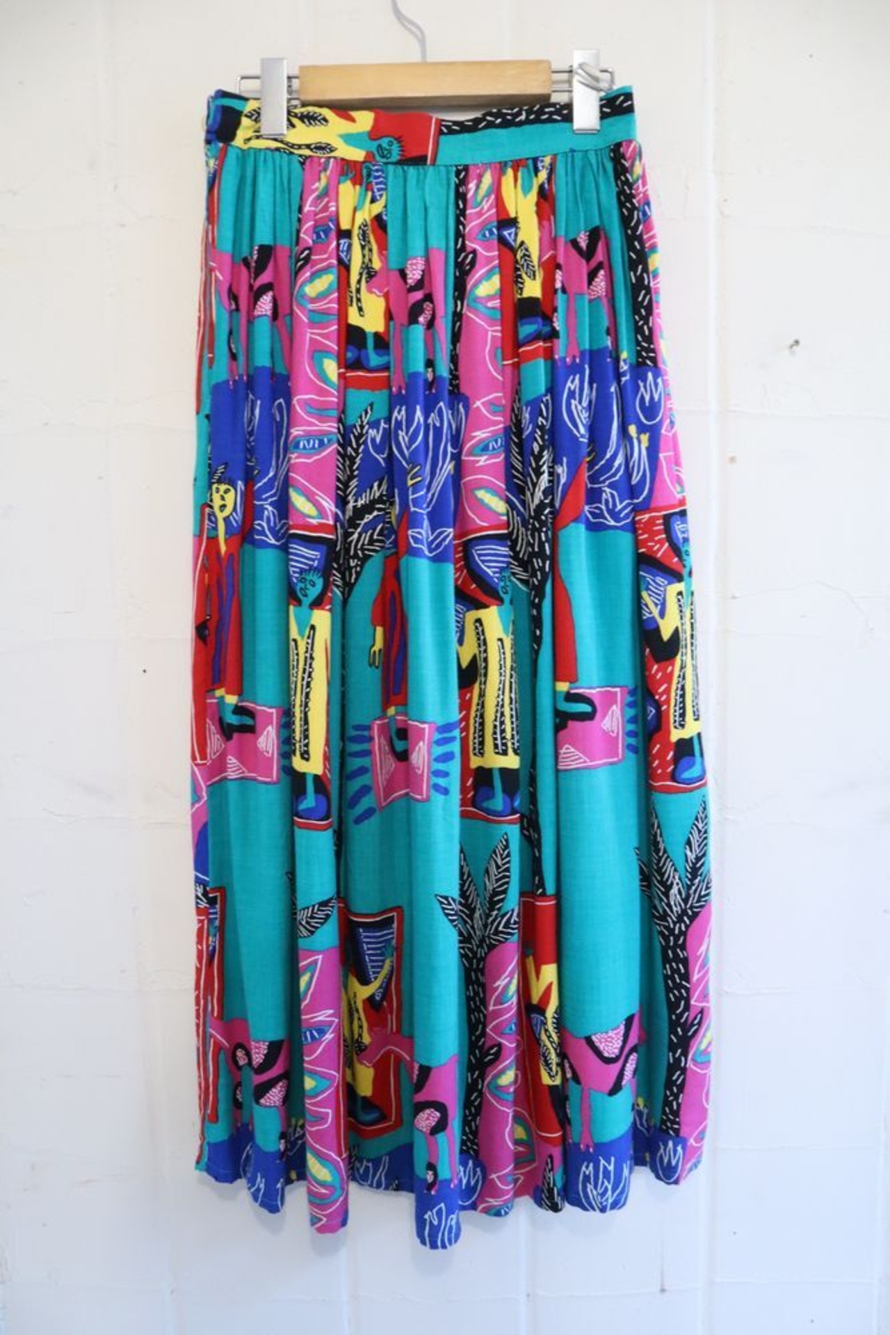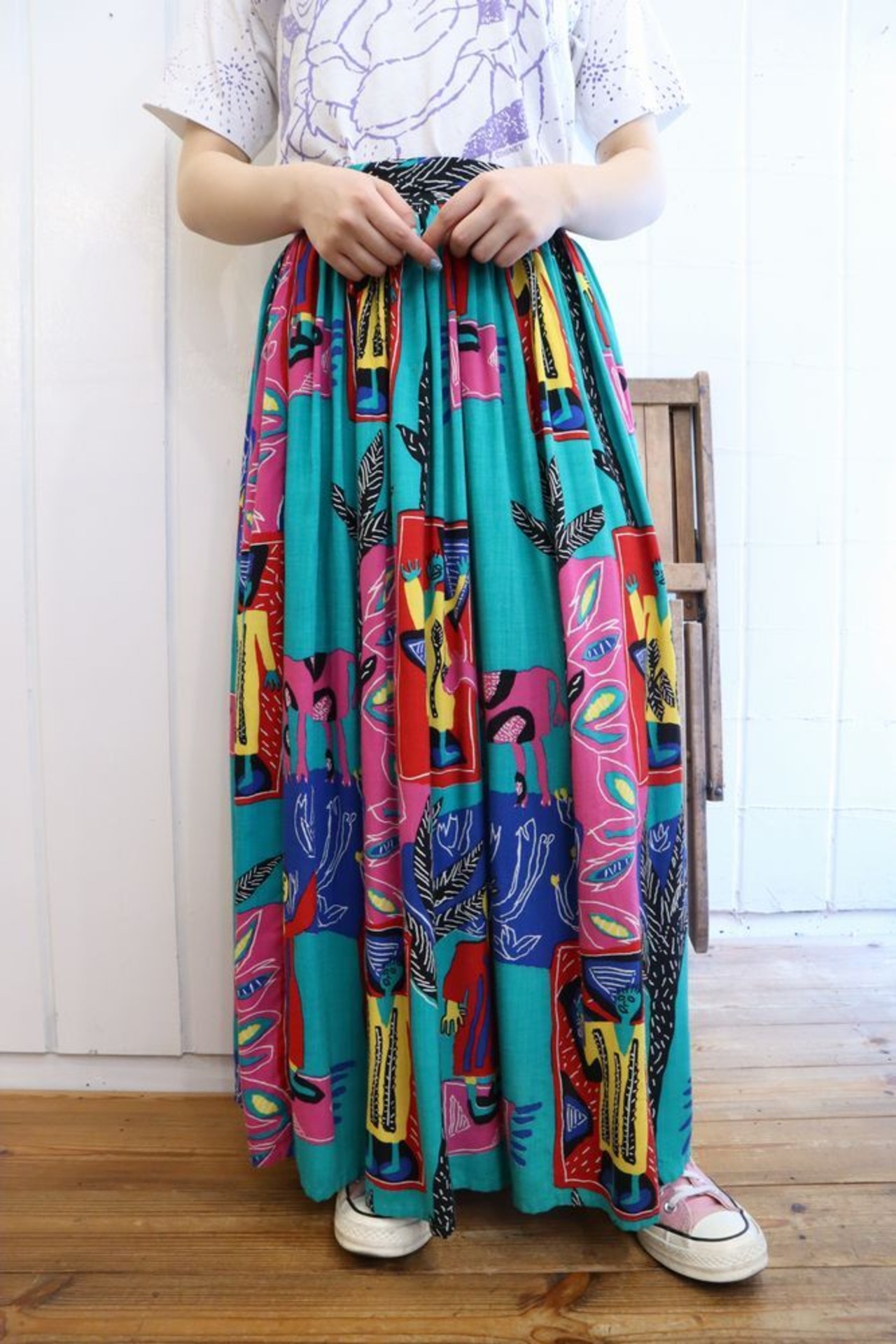 bluegreen×pink×colorful human pattern rayon skirt [l-295]