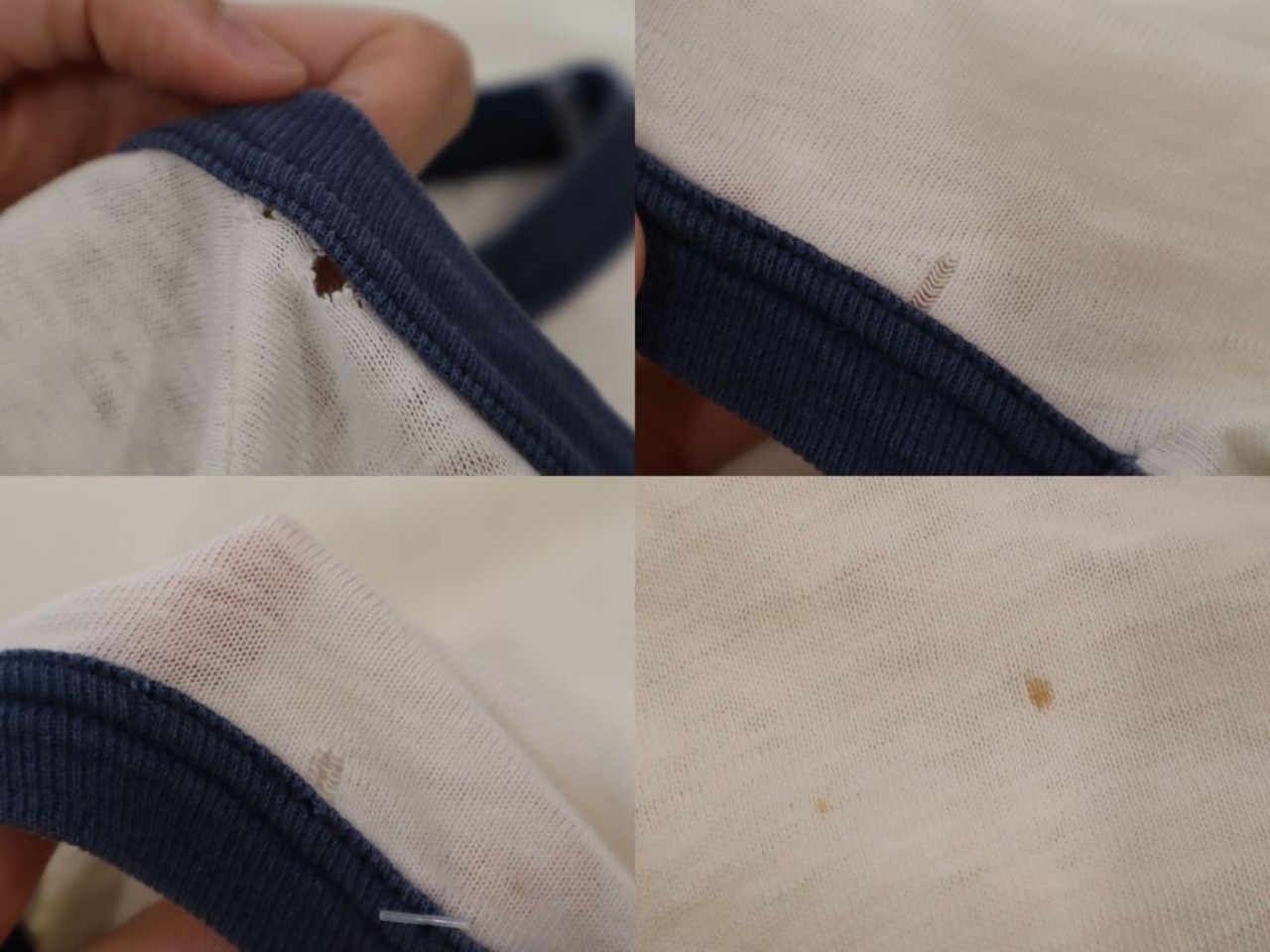 ボディに一部小穴、いくつか滑脱やシミ、薄汚れがございますが、いずれも古着の味として着て頂けるかと思われます。