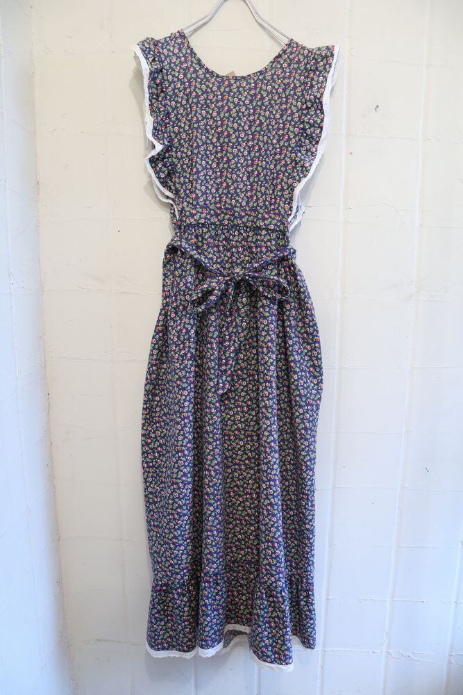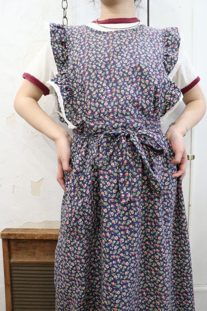 70s navy×pink×green flower patter apron dress [l-343]