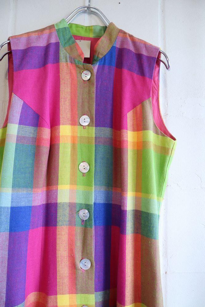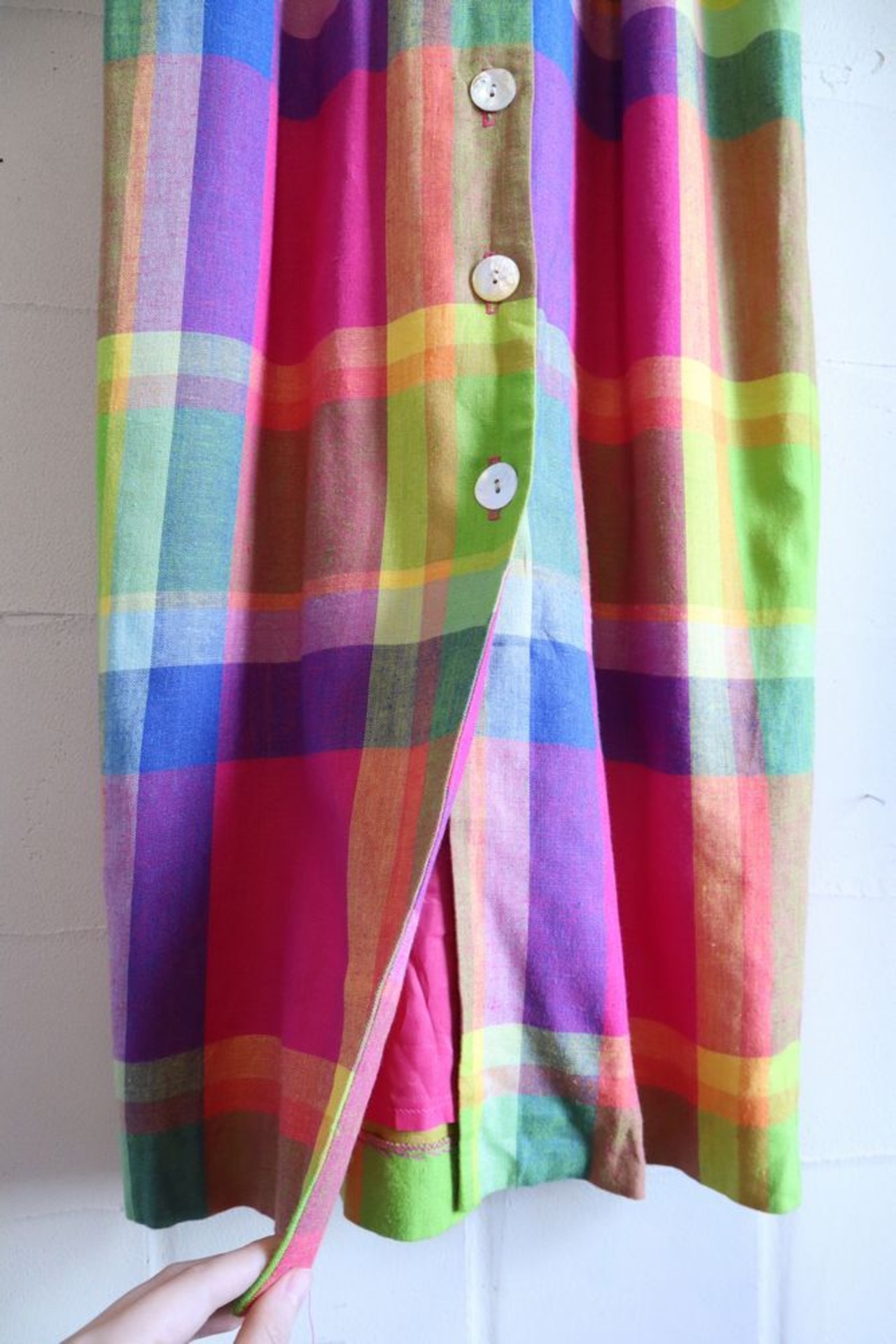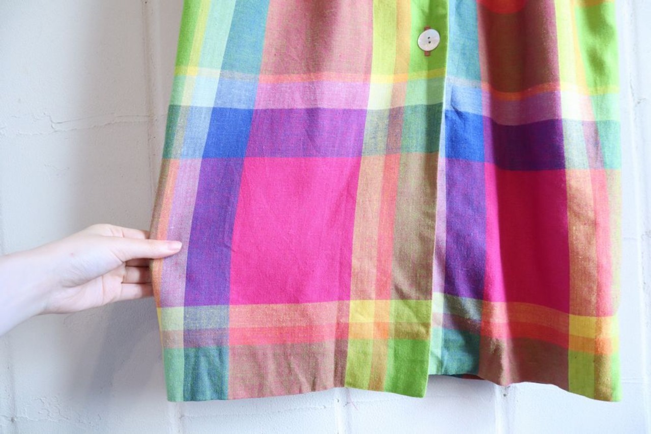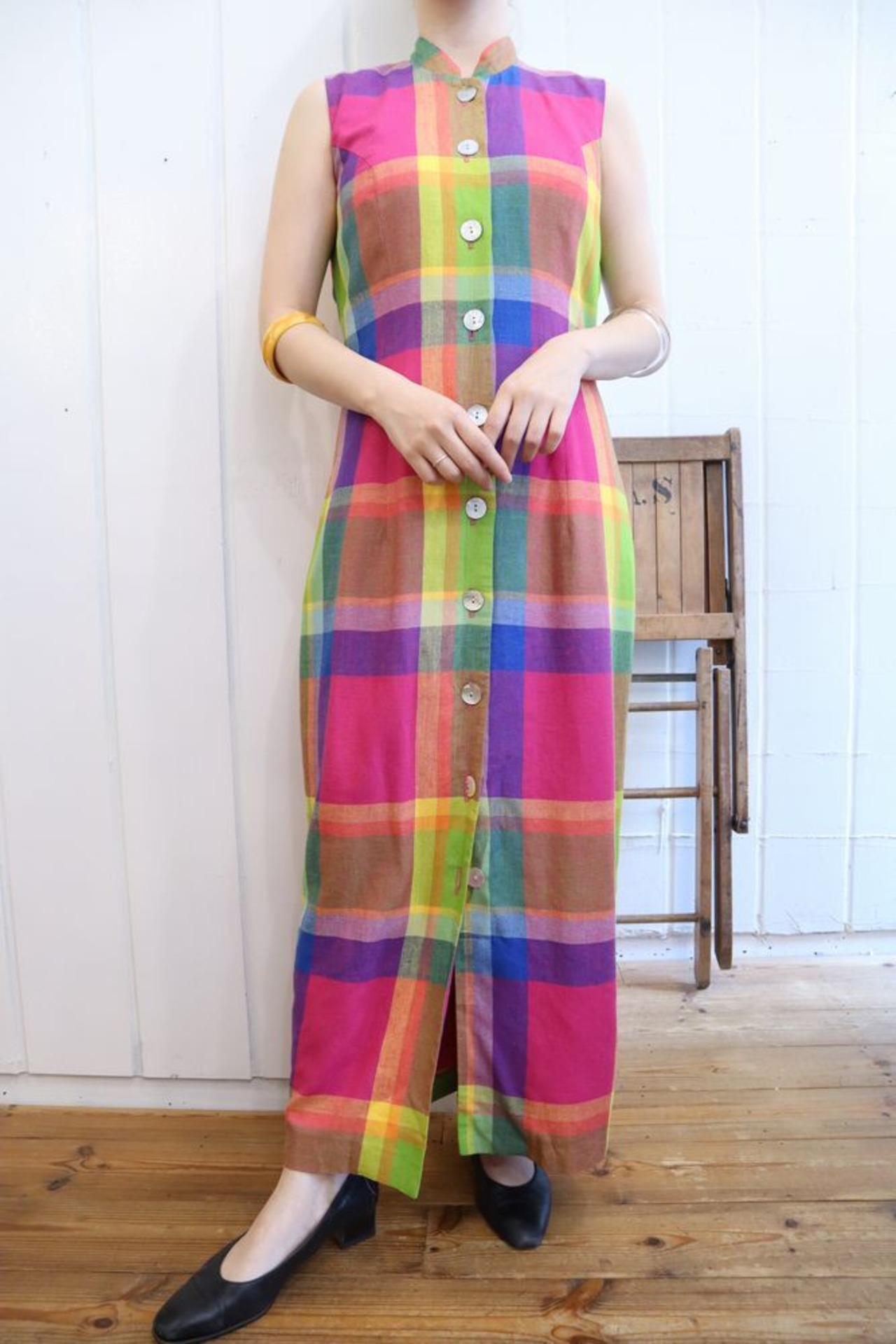 made in USA pink×colorful front shell button plaid dress [l-379]