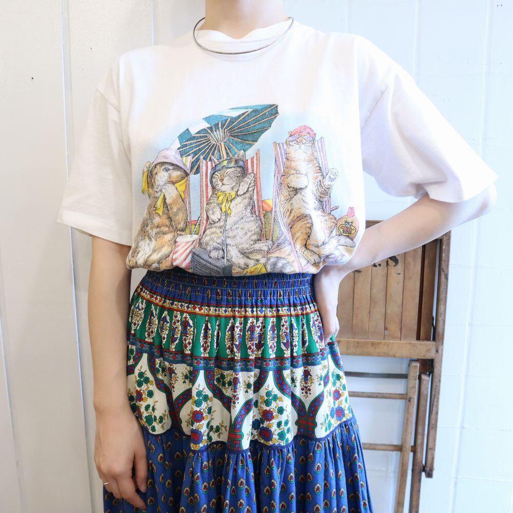 made in USA white × light blue cat print T-shirt [l-405]