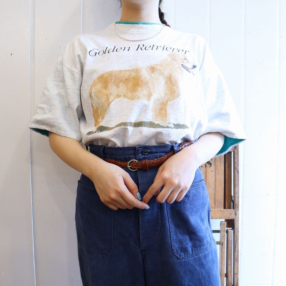 made in USA light gray × bluegreen dog print T-shirt [l-407]