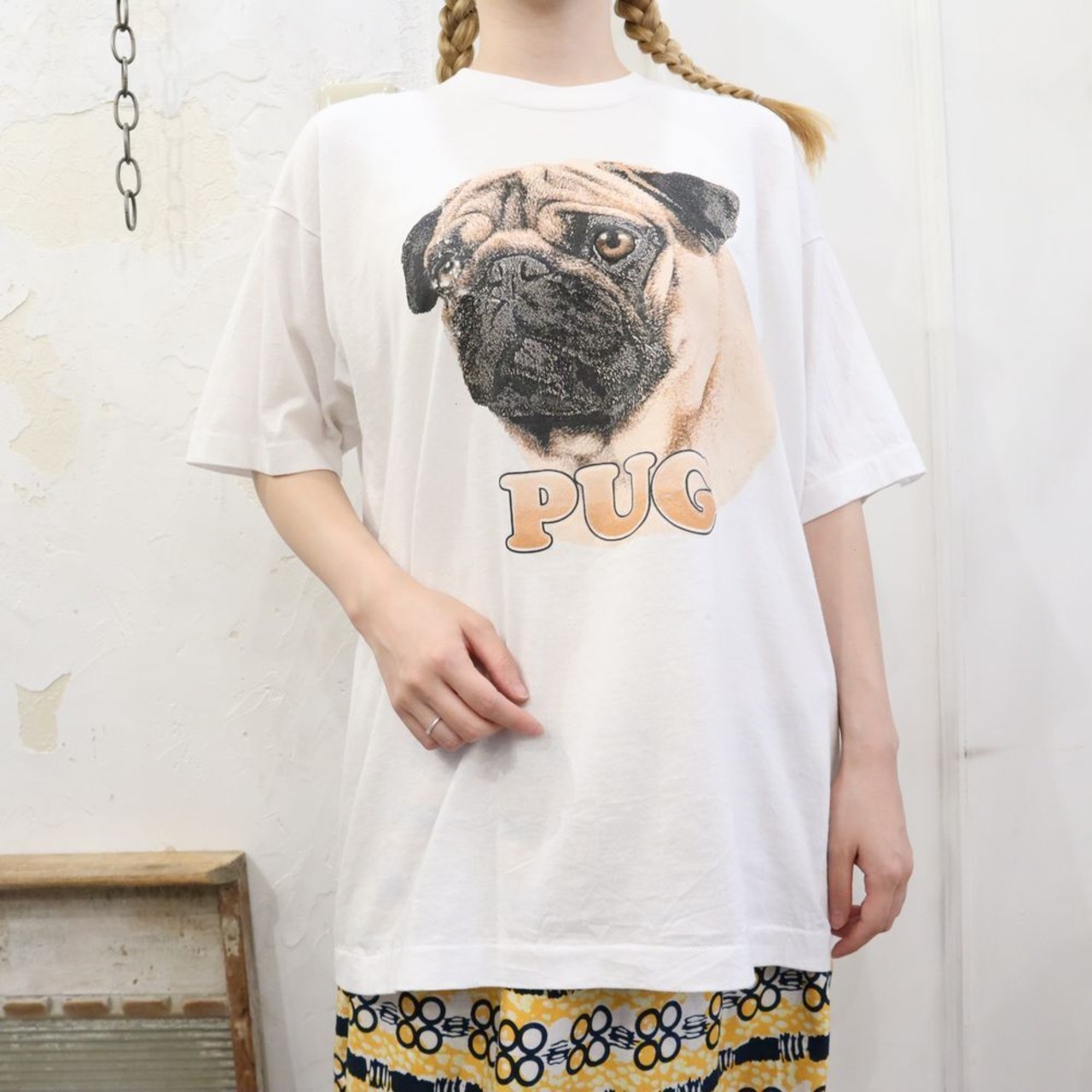 90~00s white × beige × black dog print T-shirt [l-413]