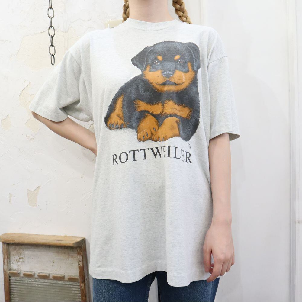 90s light gray ×brown × black dog print T-shirt [l-414]