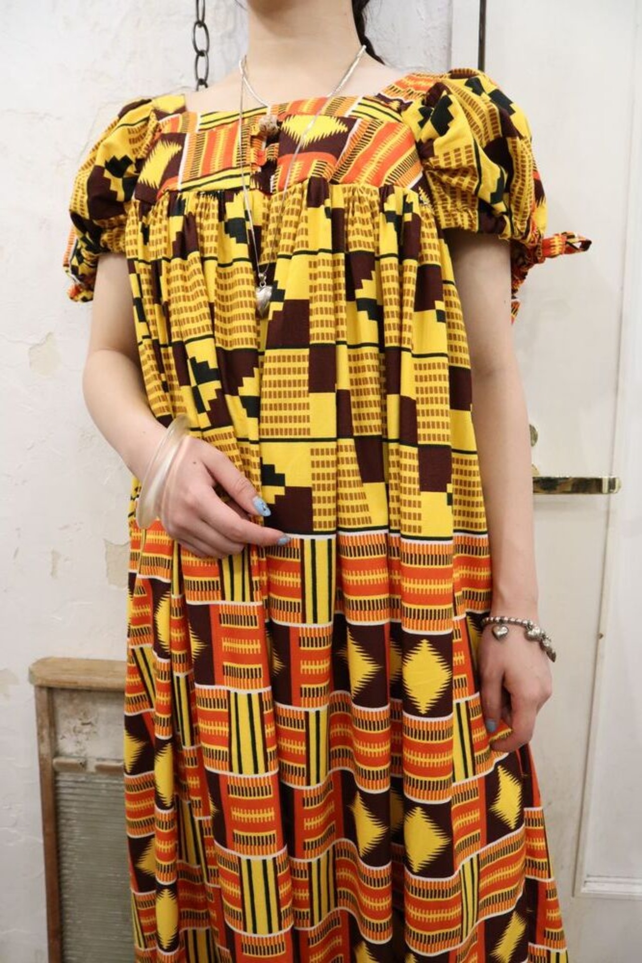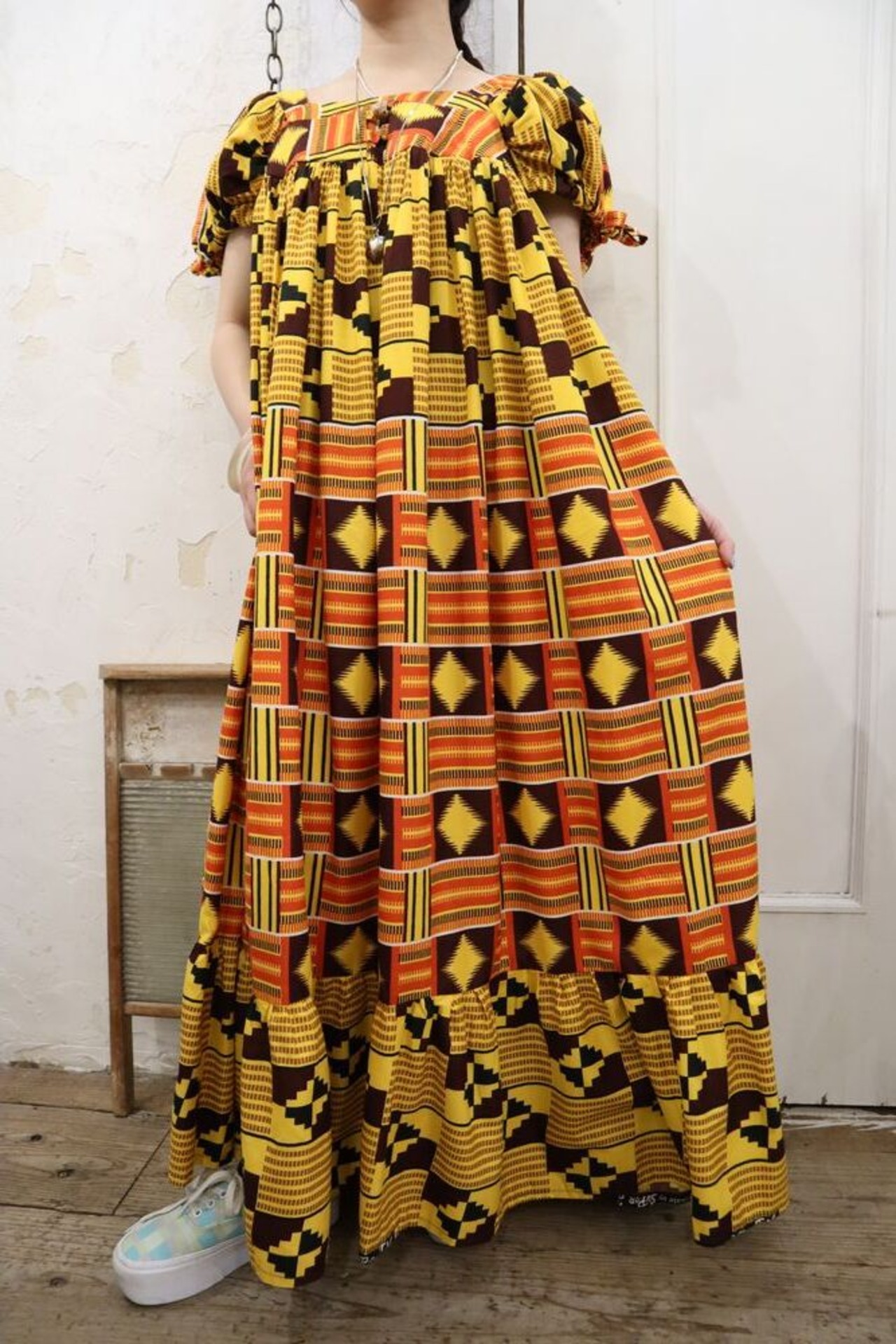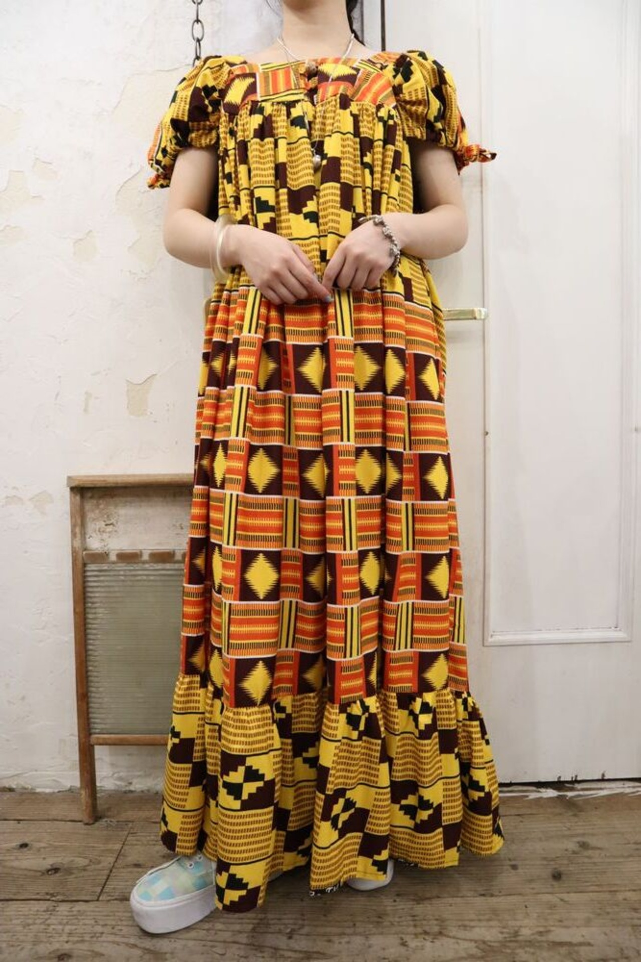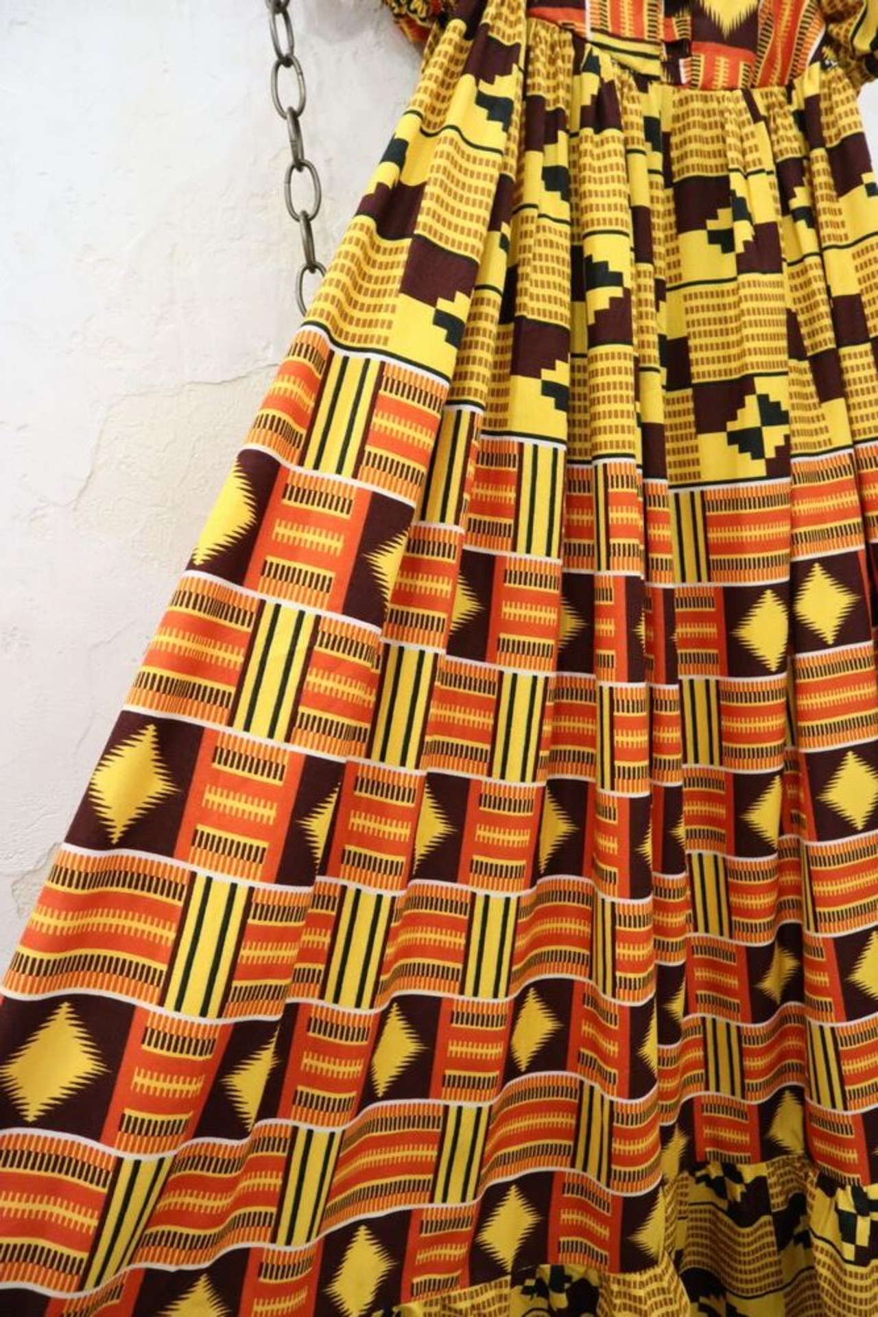 yellow × orange × brown african batik short sleeve dress [k-444]