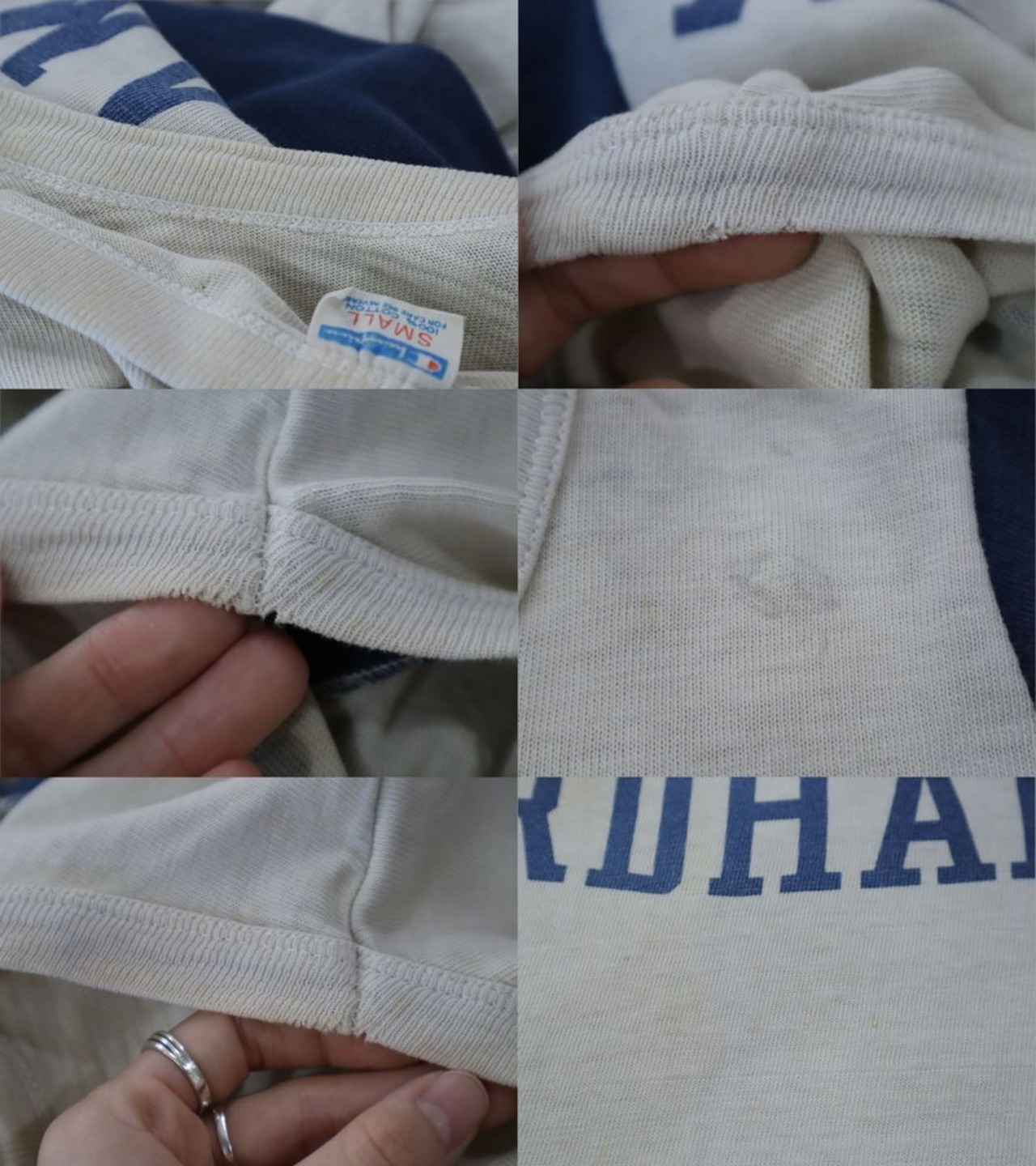リブに若干シミや小さな破れ・裾切り込み部分に目寄れ・袖に退色が見受けられます。