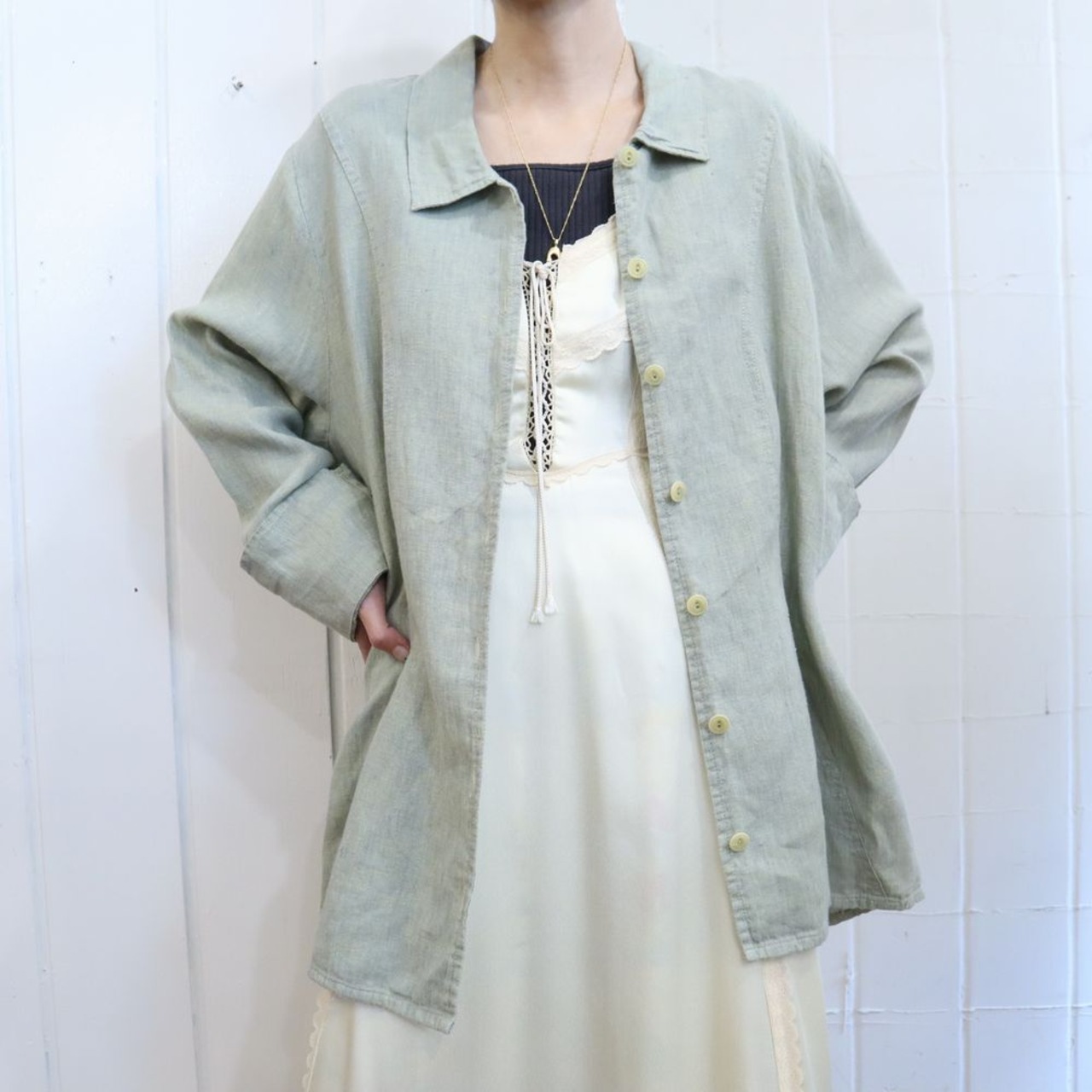 ”FLAX” pail green plain long sleeve linen shirt [k-451]