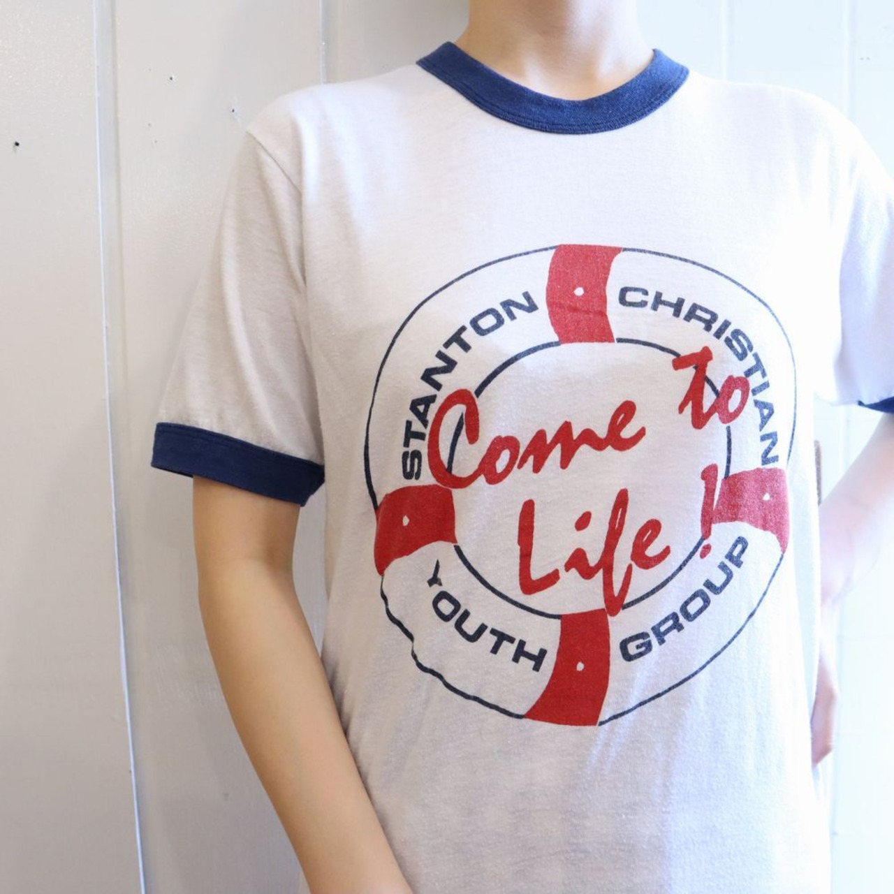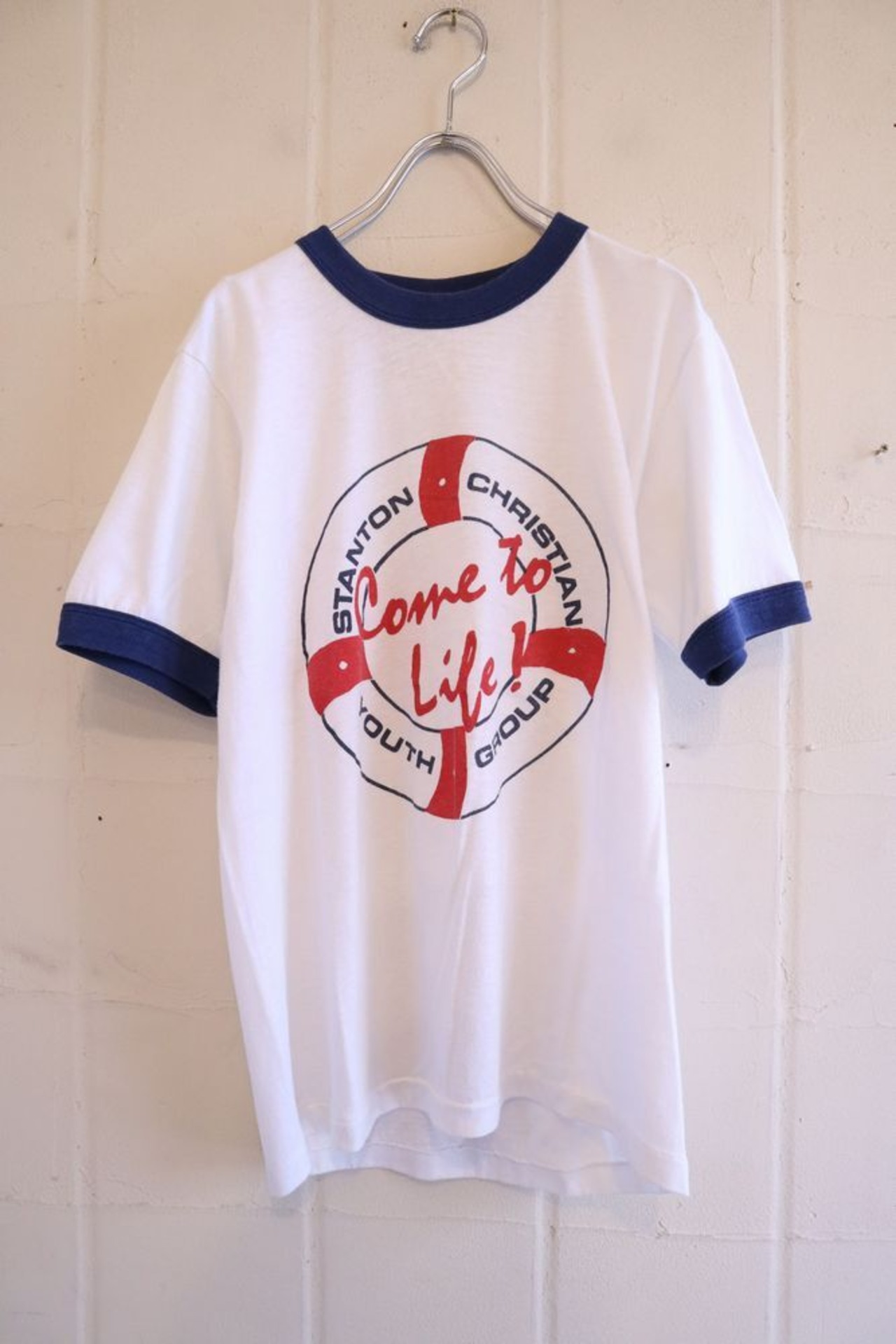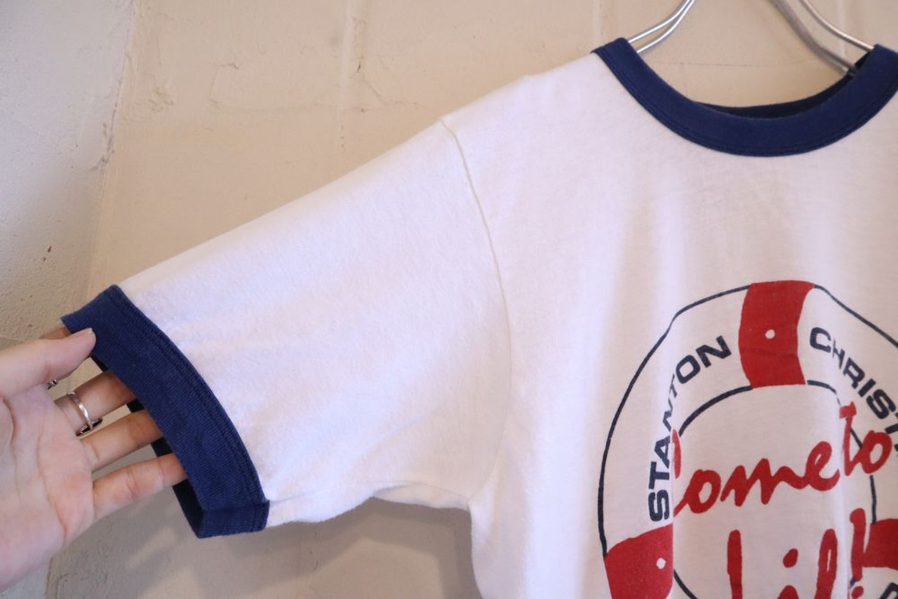 80s white×navy×red logo print ringer T-shirt [l-479]