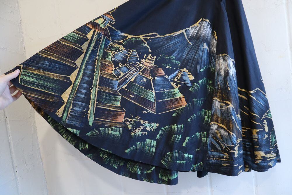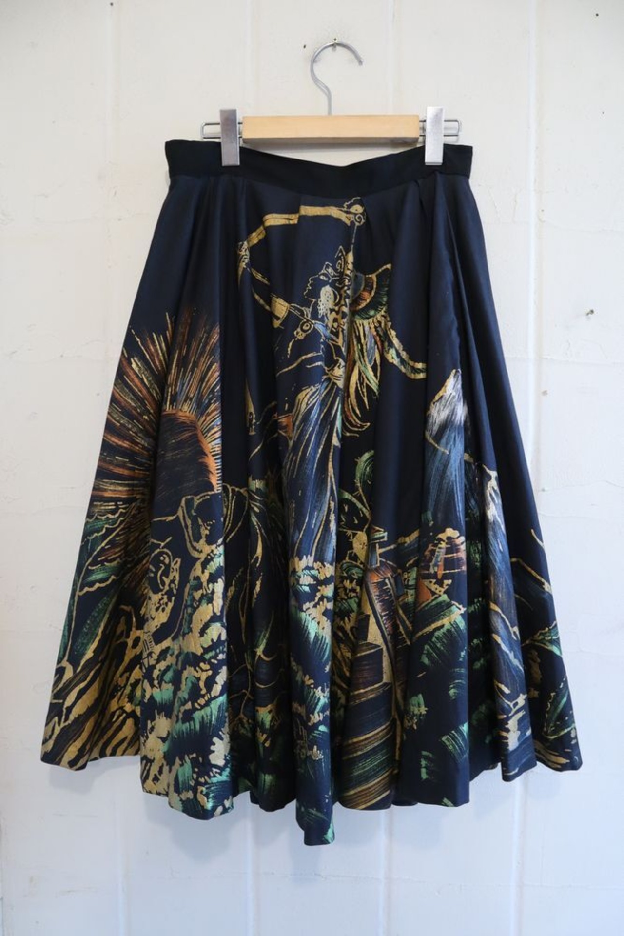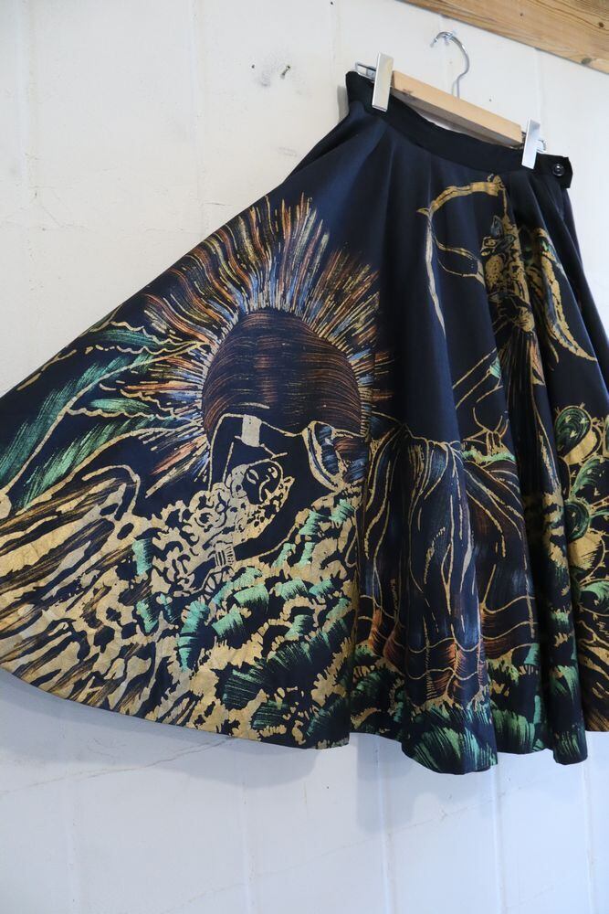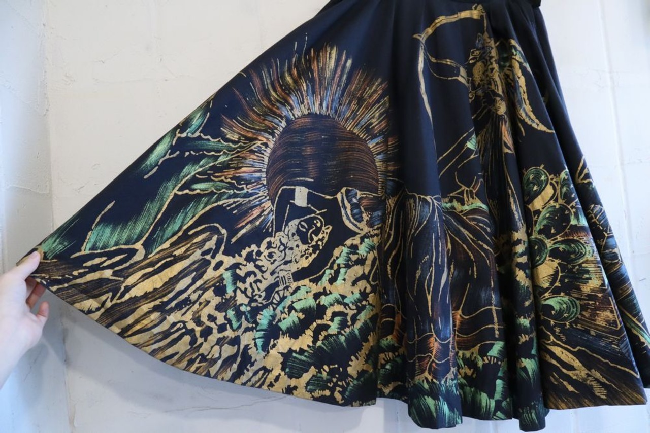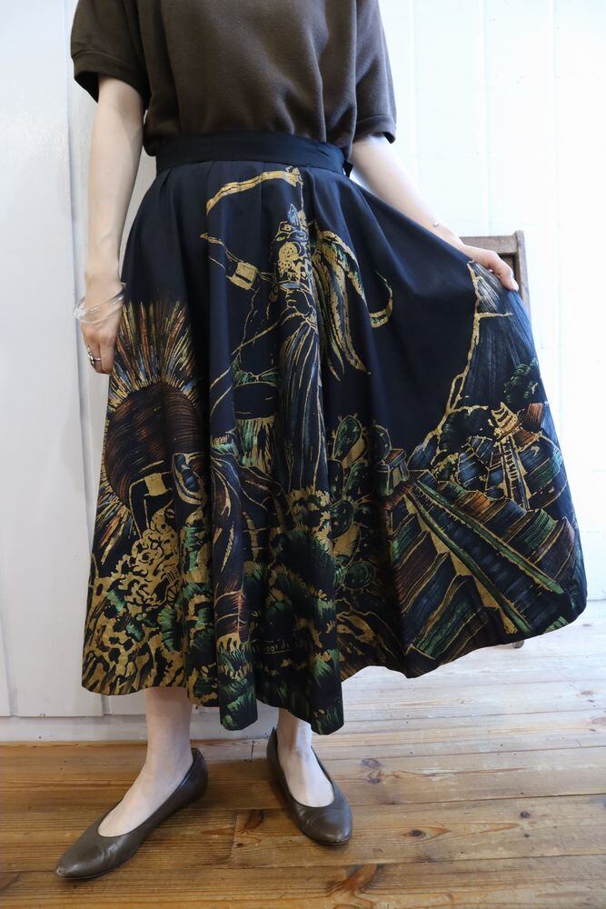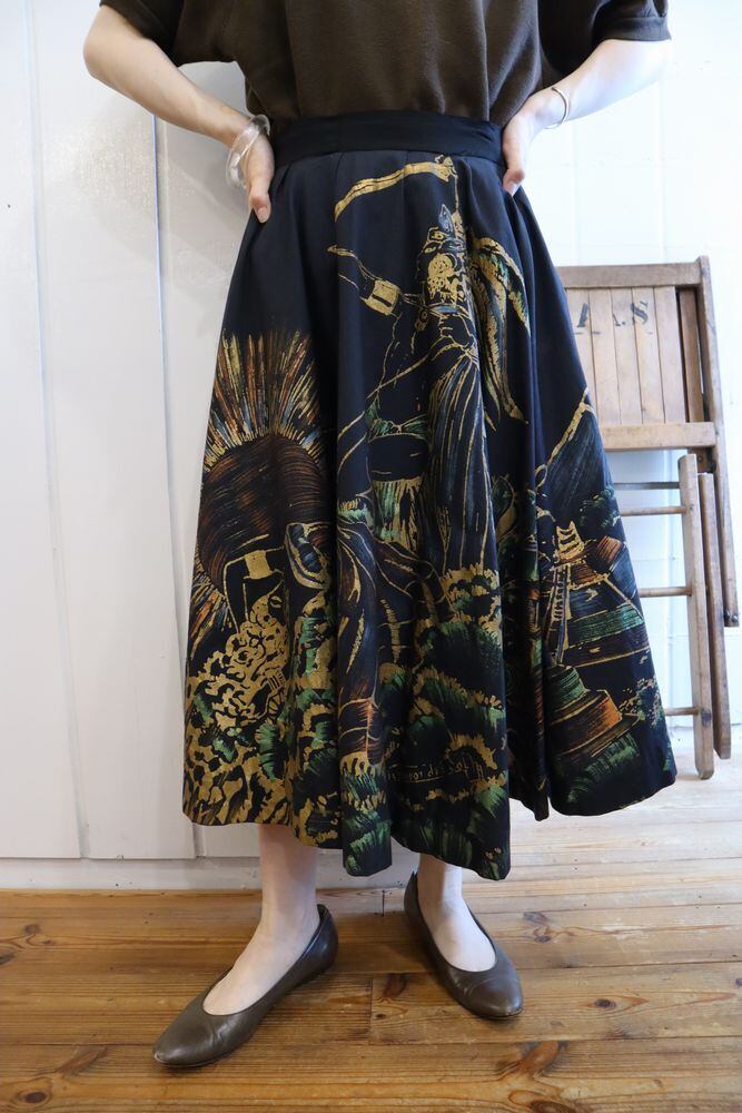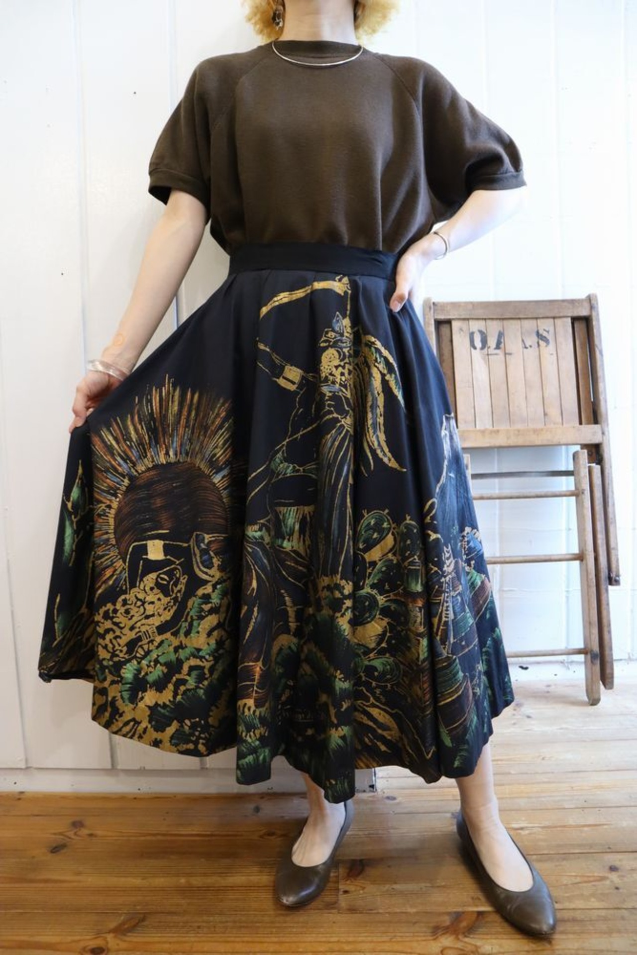 弓を構えた人や山を描いたゴールドのペイントが素敵なスカートです。