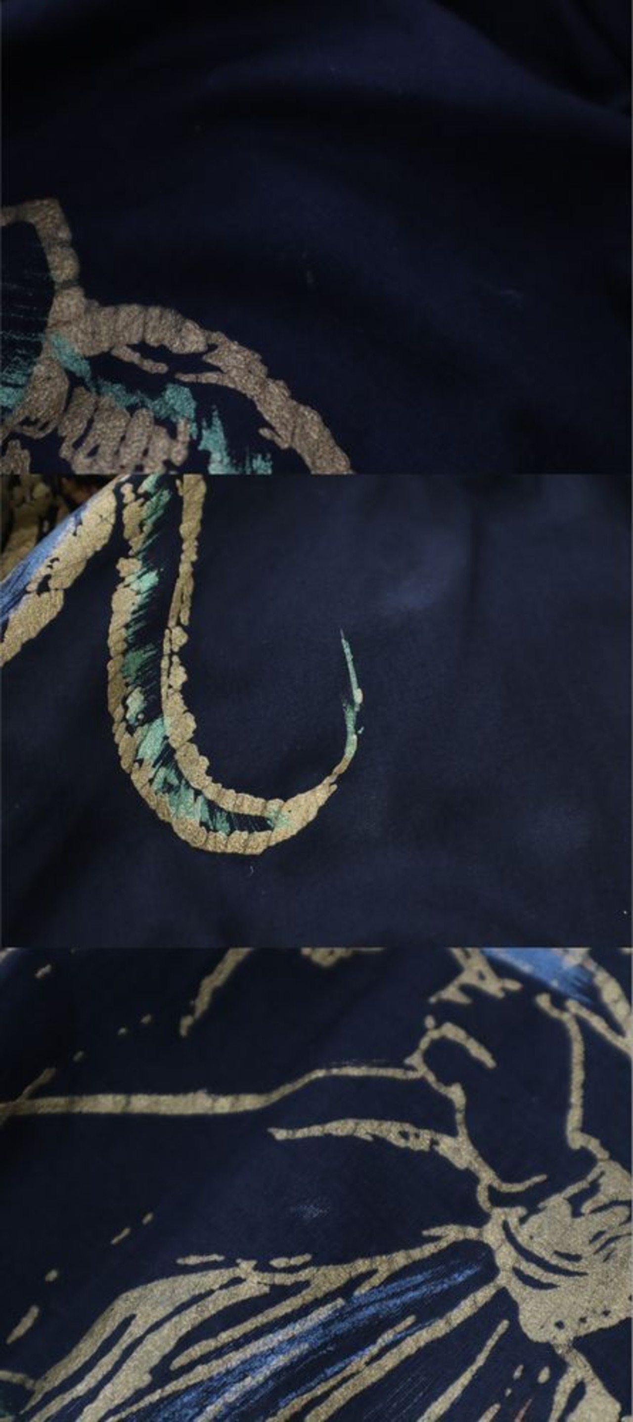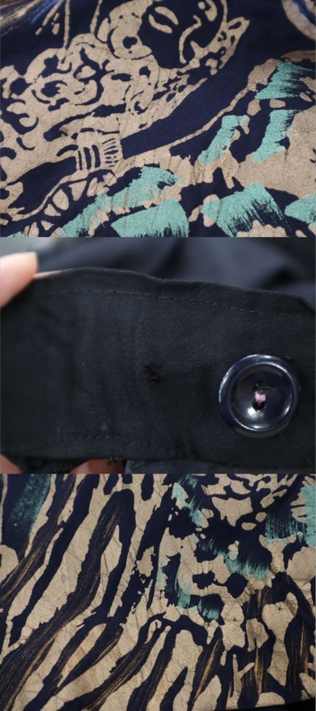 いくつかペイントによって生地が白っぽくなっている箇所、一部小穴、ペイント部分にいくつかひび割れがございますが、古着の味として着ていただけるかと思われます。