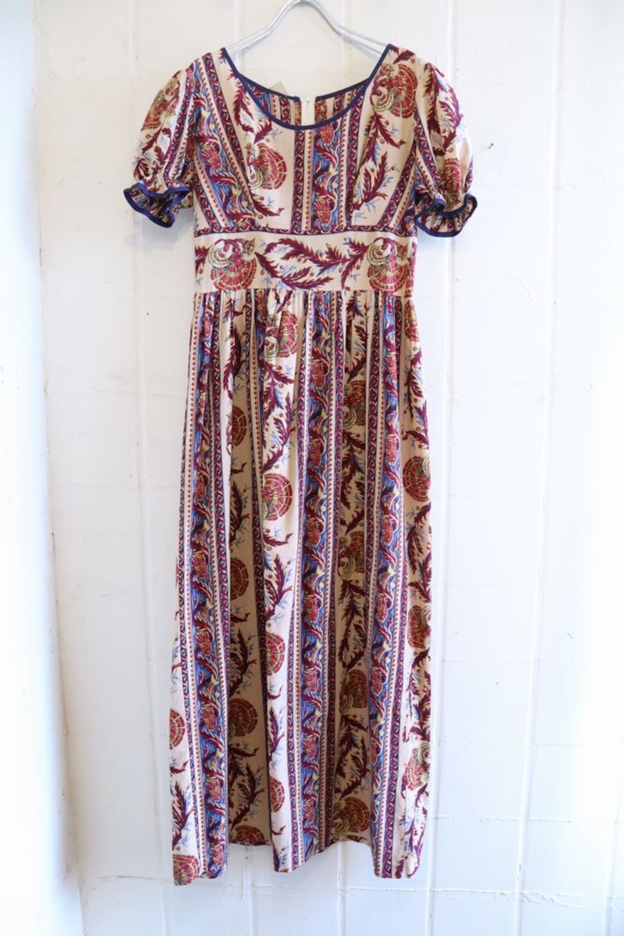 70s beige×red×blue fish pattern long dress [l-551]