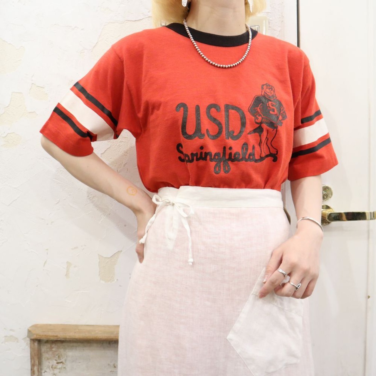 いくつか小さなれやプリントのひび割れがございますが、古着の味わいとして着て頂けるかと思われます。