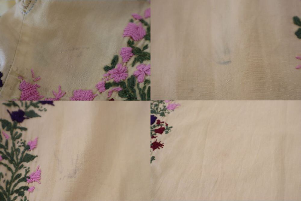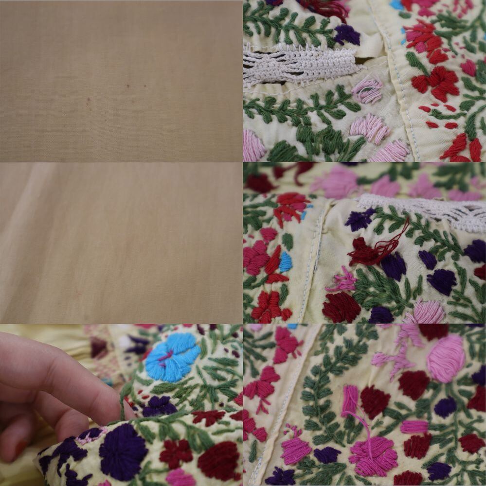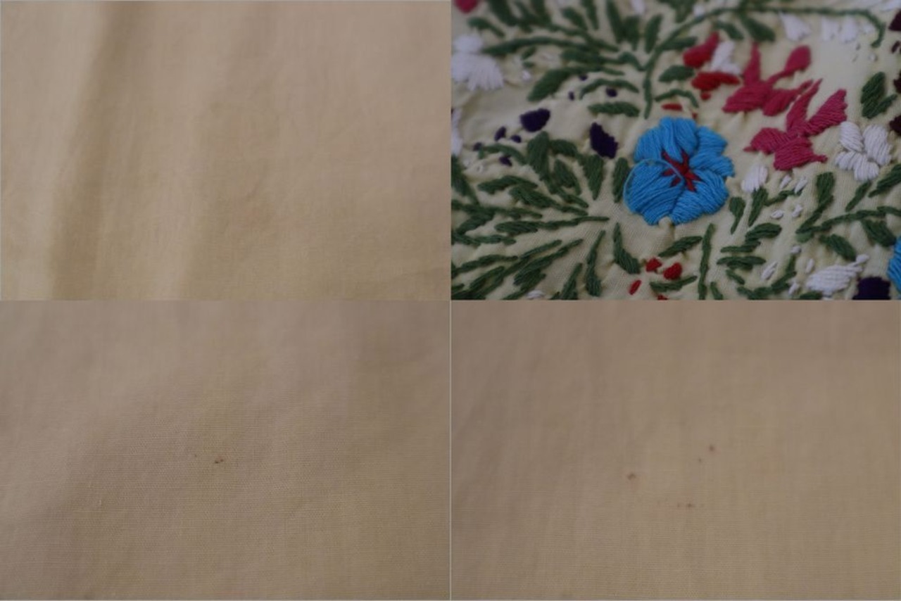 いくつか汚れやシミ、刺繍糸のツレや糸の飛び出しが見受けられますが、古着の味として着て頂けるかと思われます。