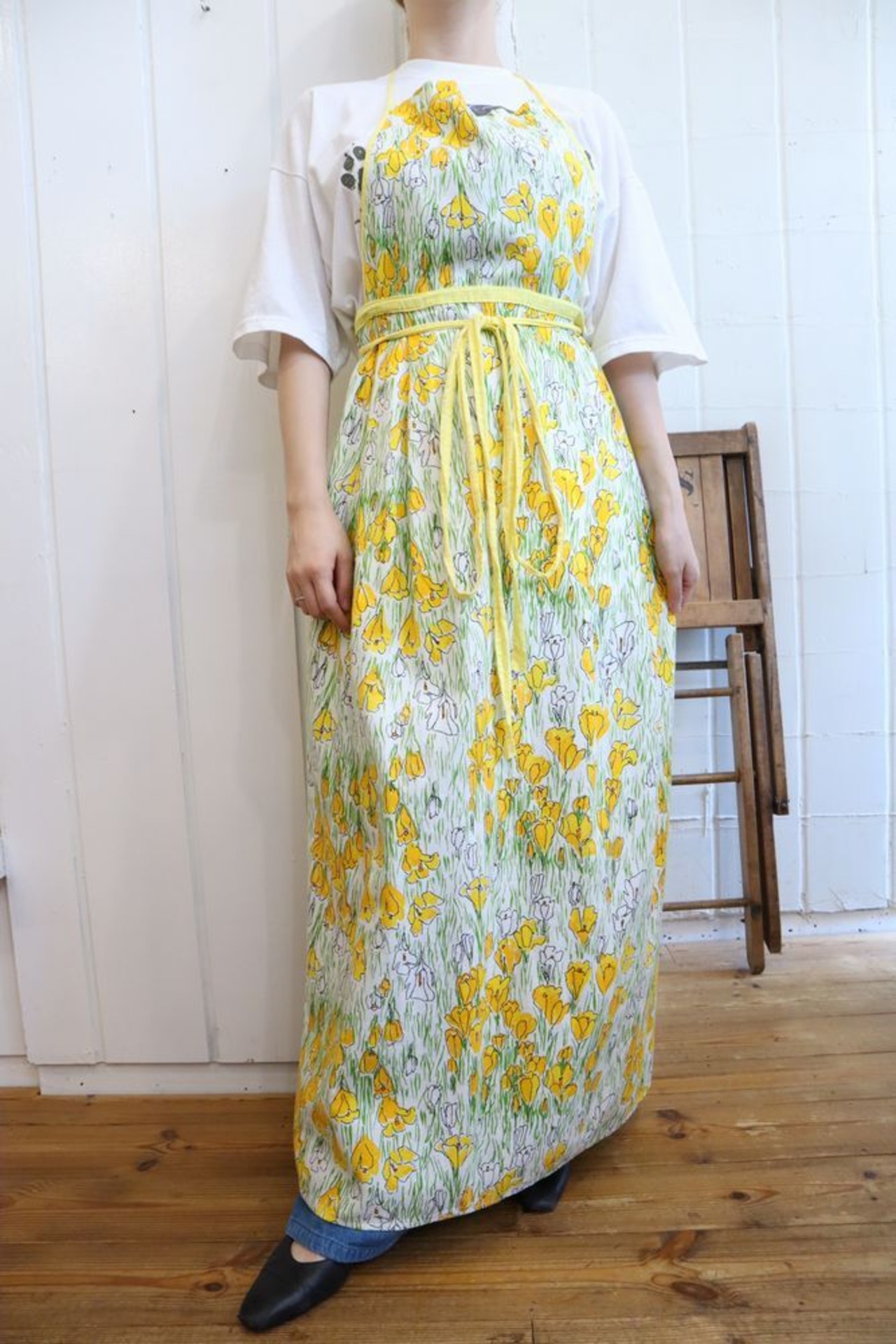 white×yellow×green flower pattern apron dress [l-592]