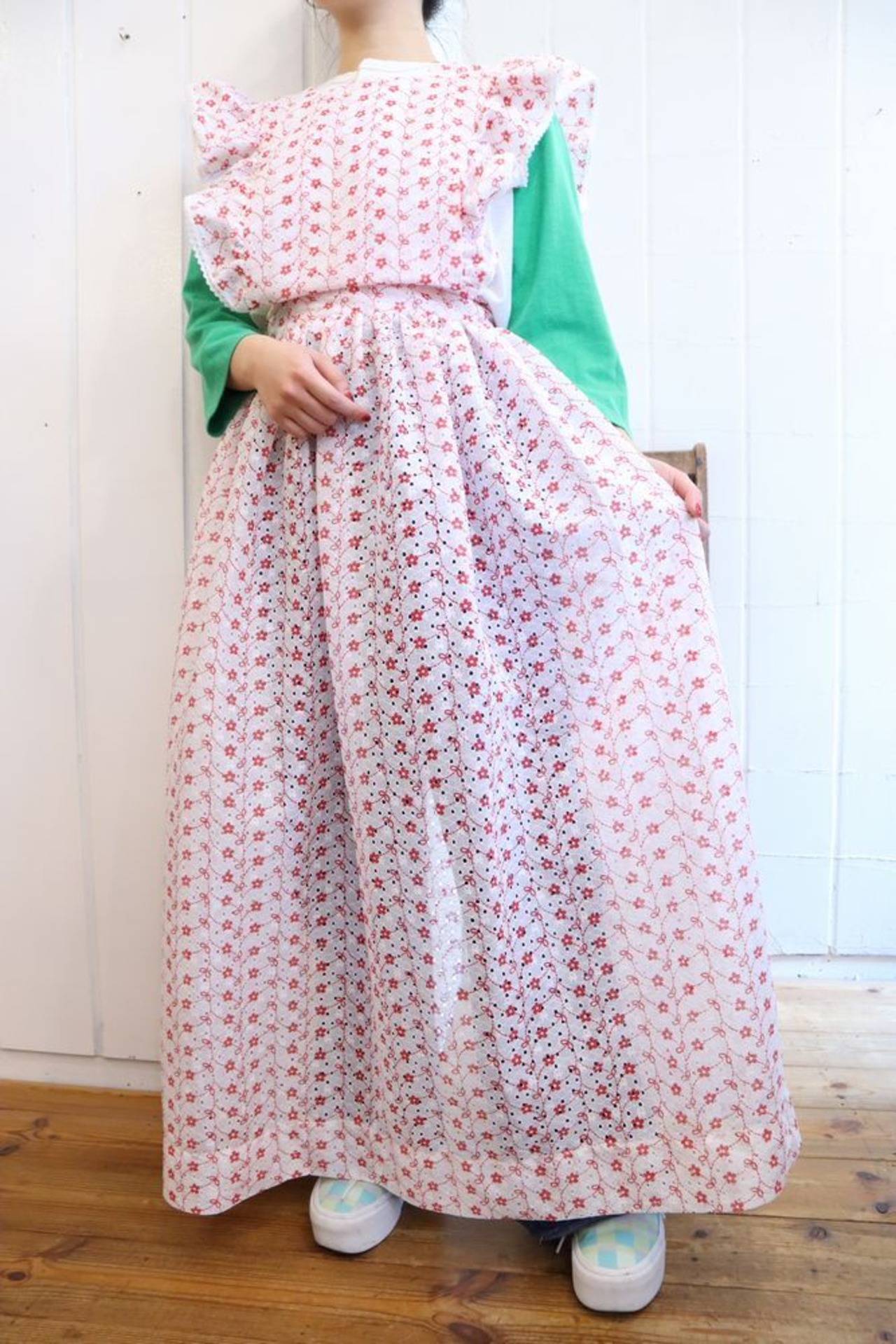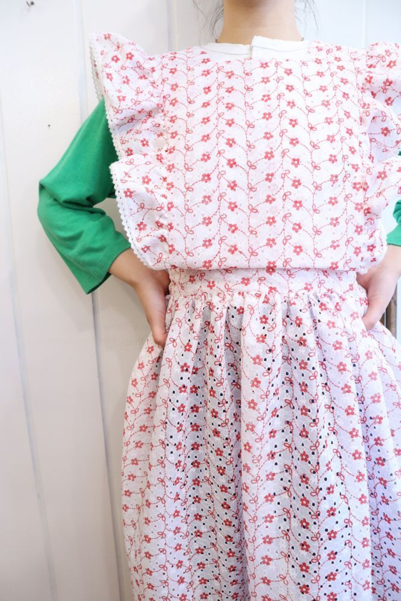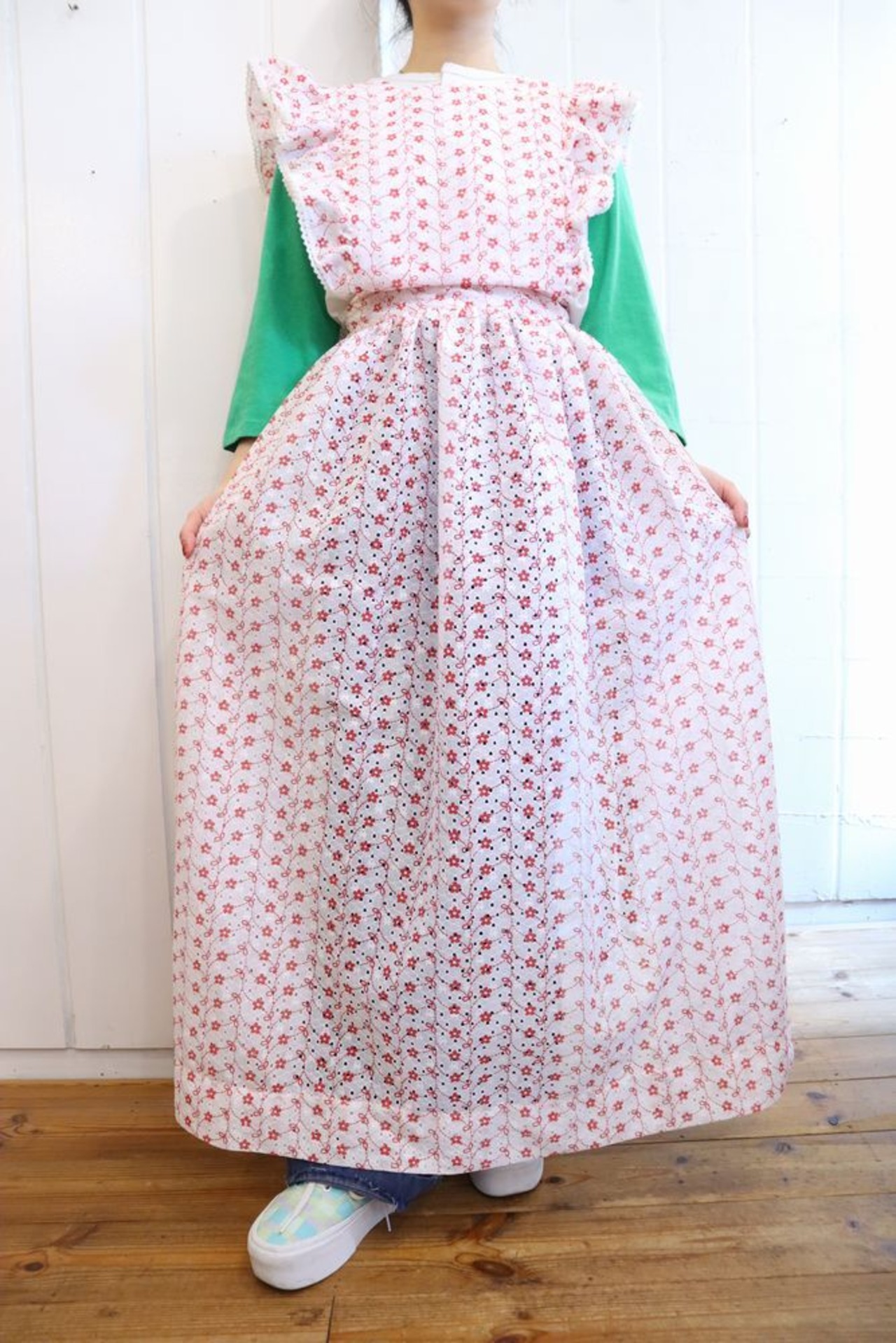 お花のプリントと〇のカットワークが可愛いエプロンドレスです。