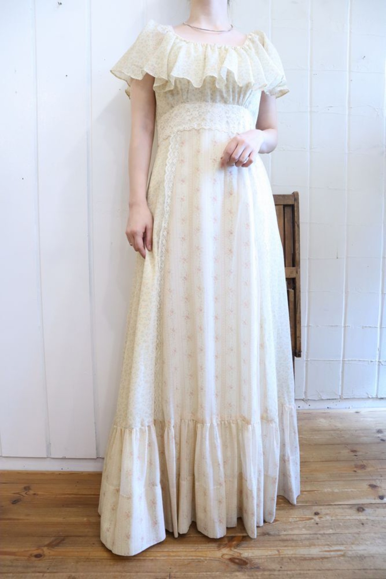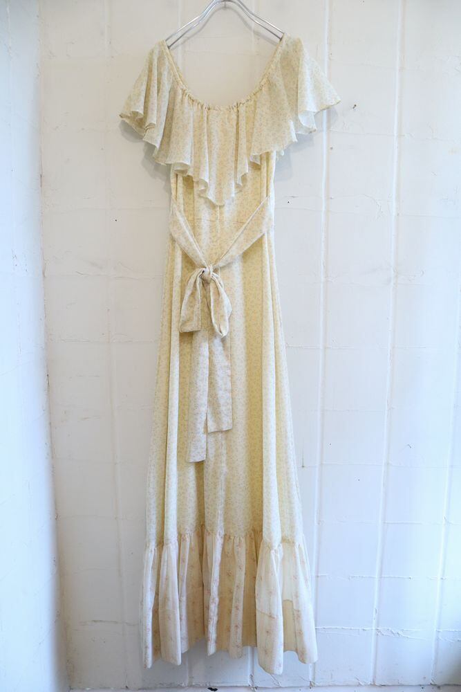 70s lightbeige×pailorange cape collar flower long dress [l-641]