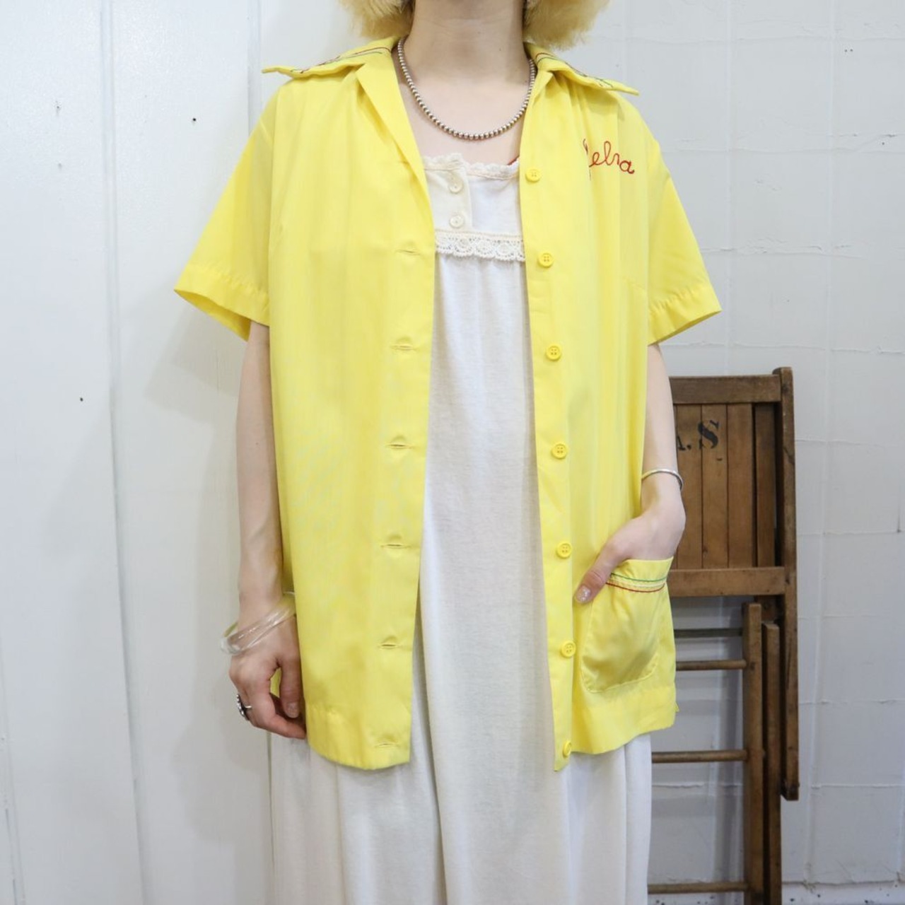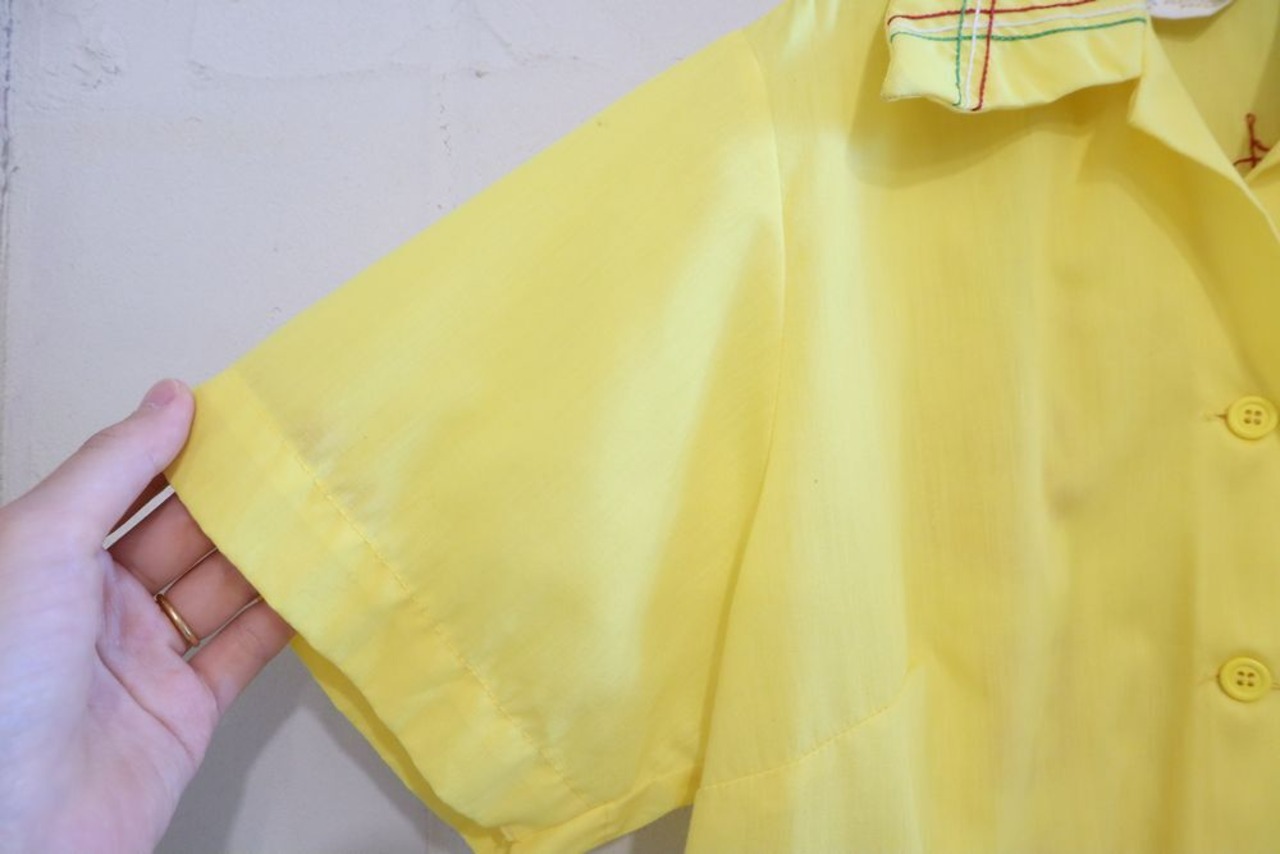 60s-70s yellow×red chain stitch & print bowling shirt [l-664]
