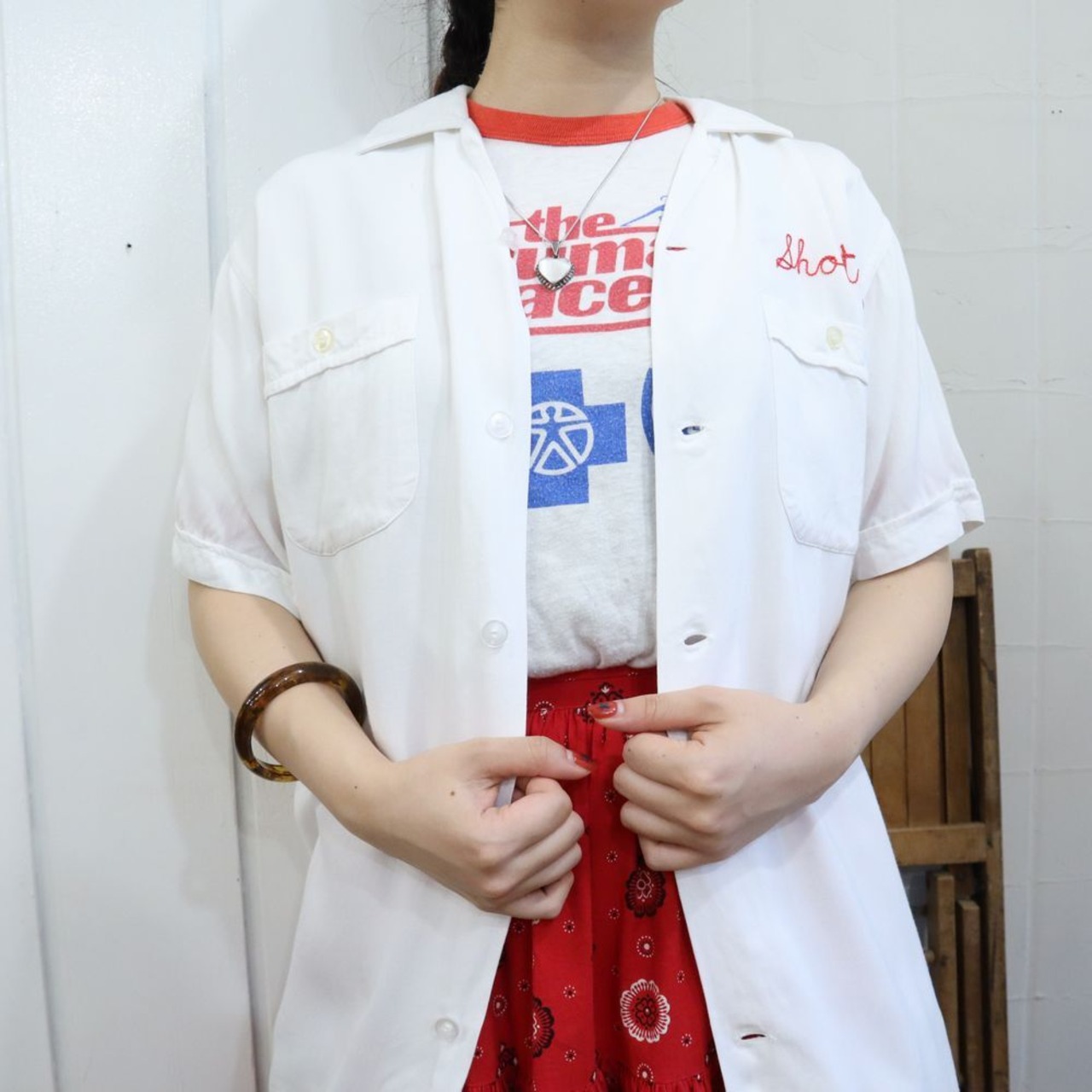 60s- white×red×beige chain stitch & wappen bowling shirt [l-665]