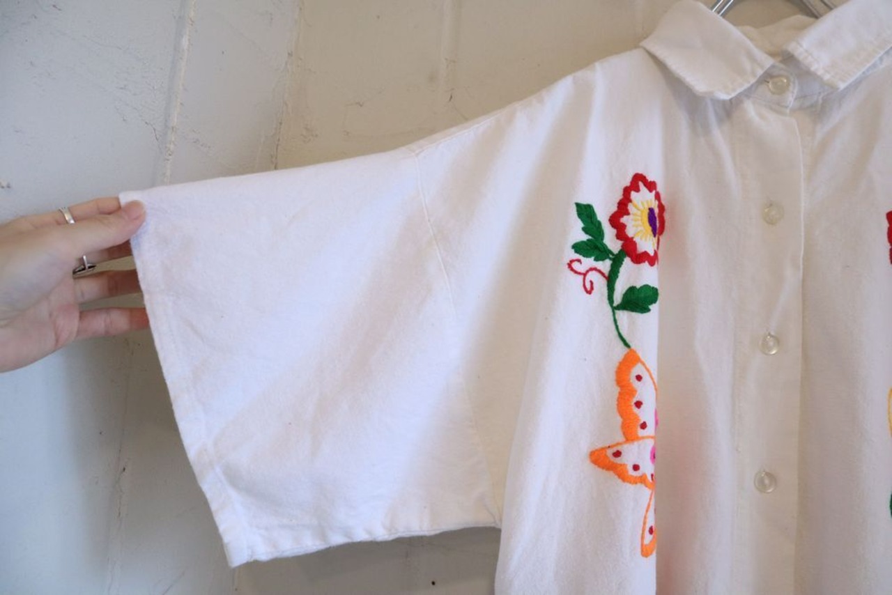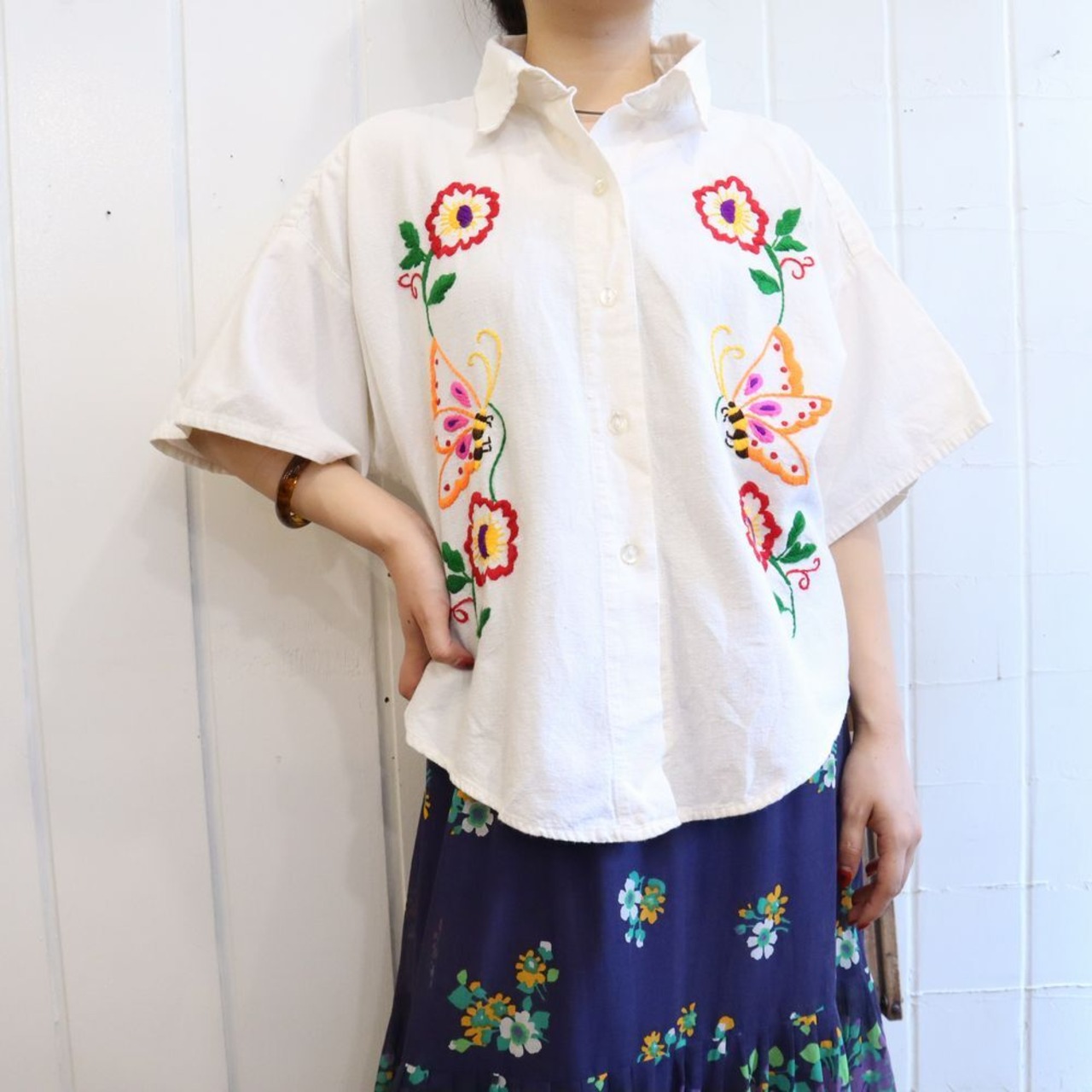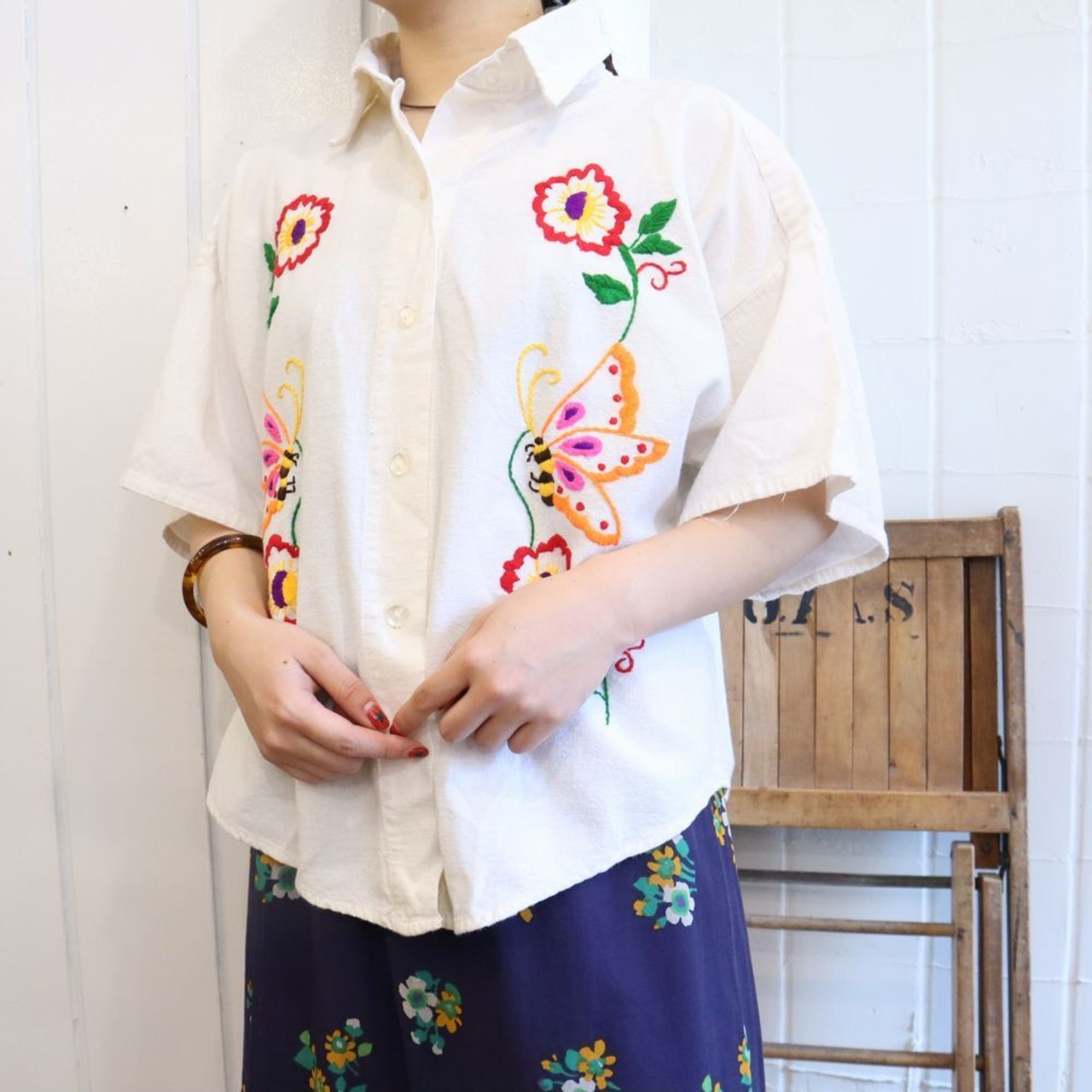 white×colorful butterfly&flower embroidery shirt [l-683]