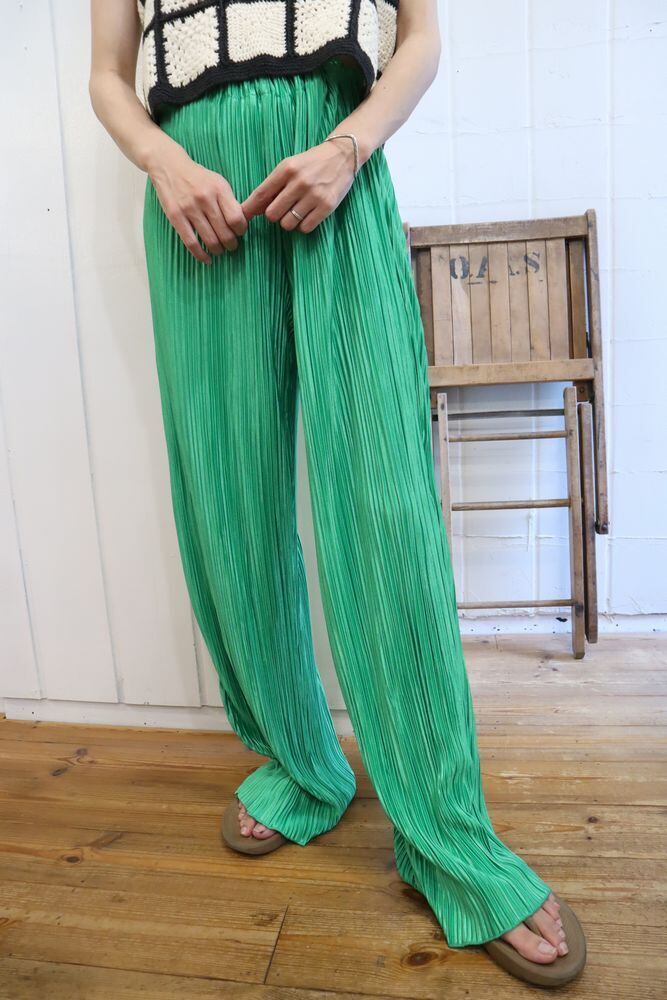 色鮮やかなグリーンが可愛いプリーツパンツです。