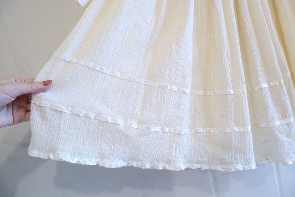 スクエアネックやボリューム感のあるお袖と裾、かぎ編みやサテンテープの切替など可愛いポイントがたくさんな一枚ですね♡