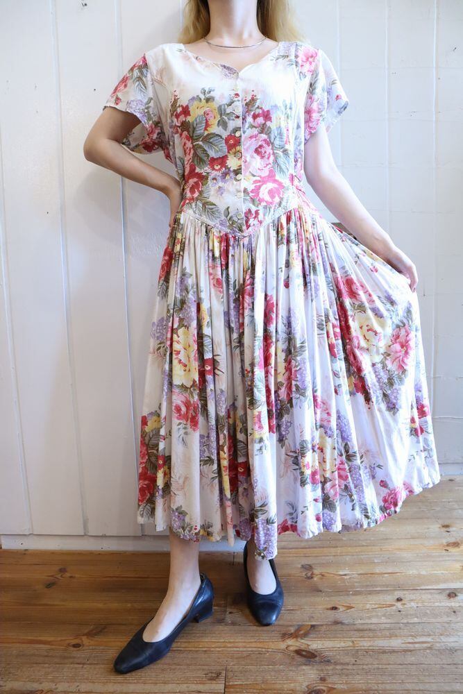white×pinkred flower pattern dress [l-708]