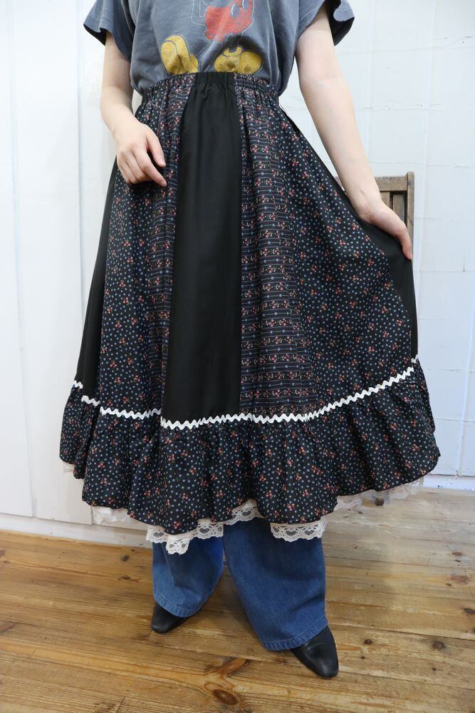 made in USA black×white×pink flower&lace flare skirt [l-709]