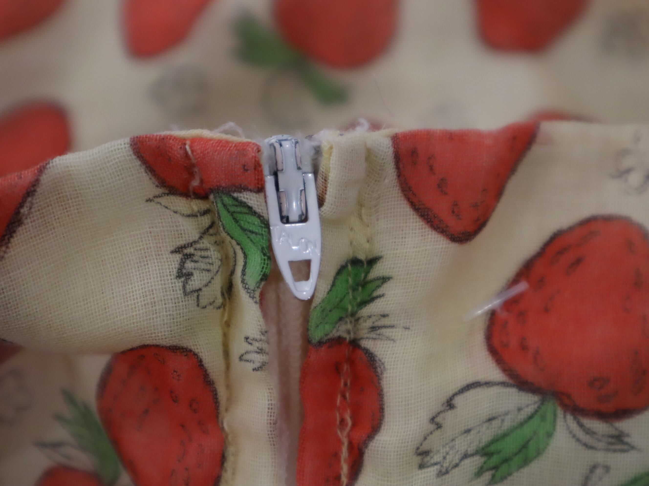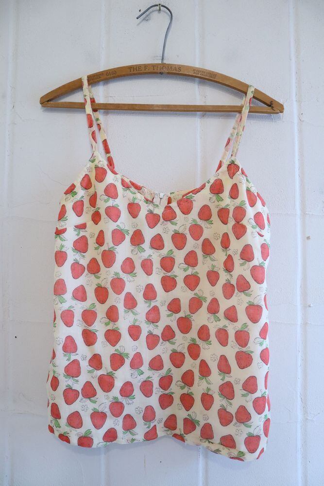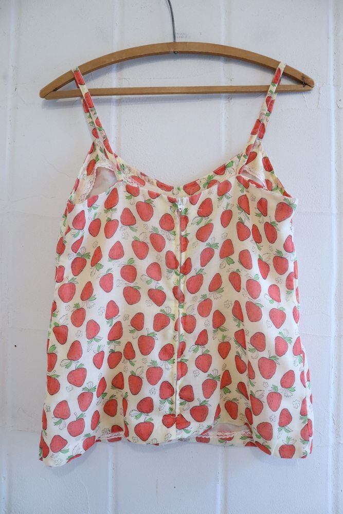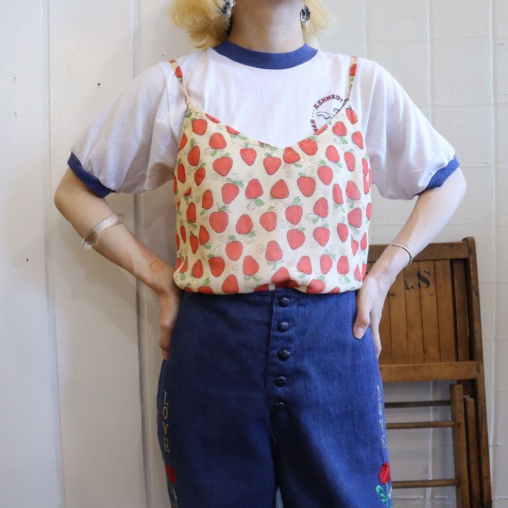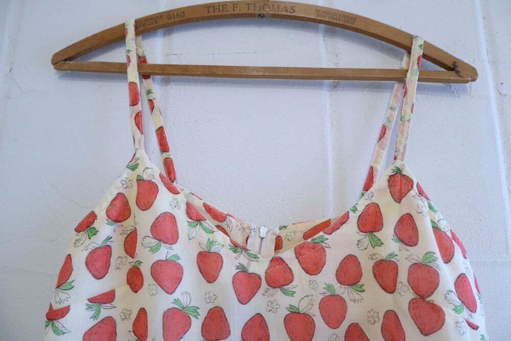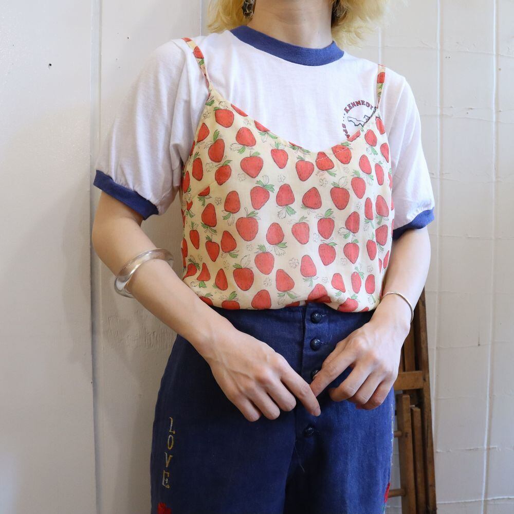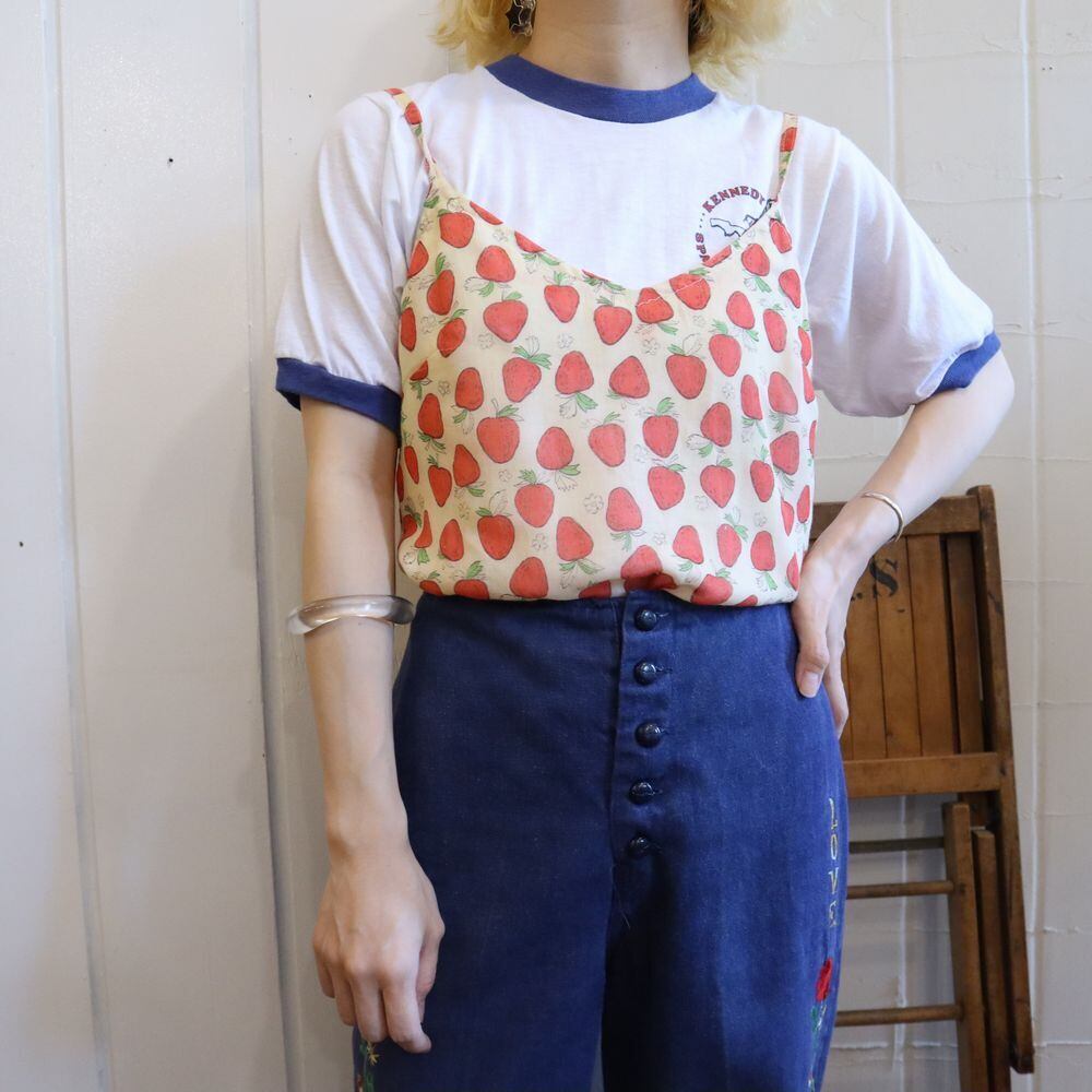 70s cream×red×green strawberry pattern sleeveless tops [l-716]