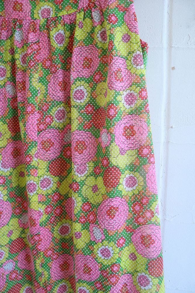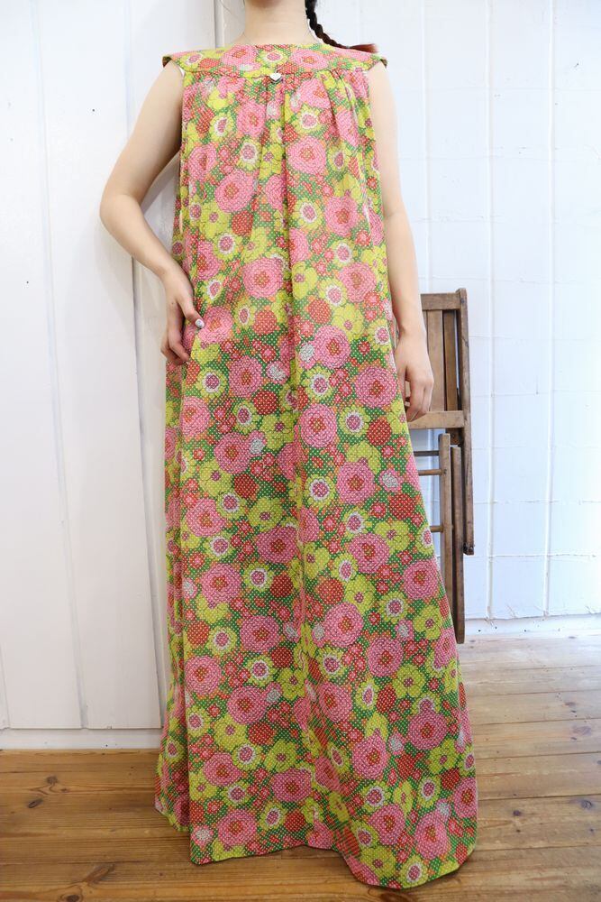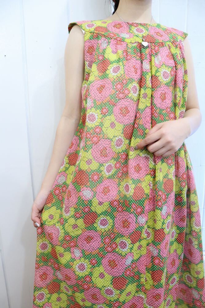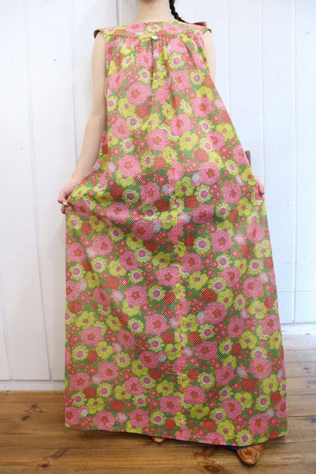 60-70s green×lightgreen×pink dot&flower pattern see through dress [l-743]