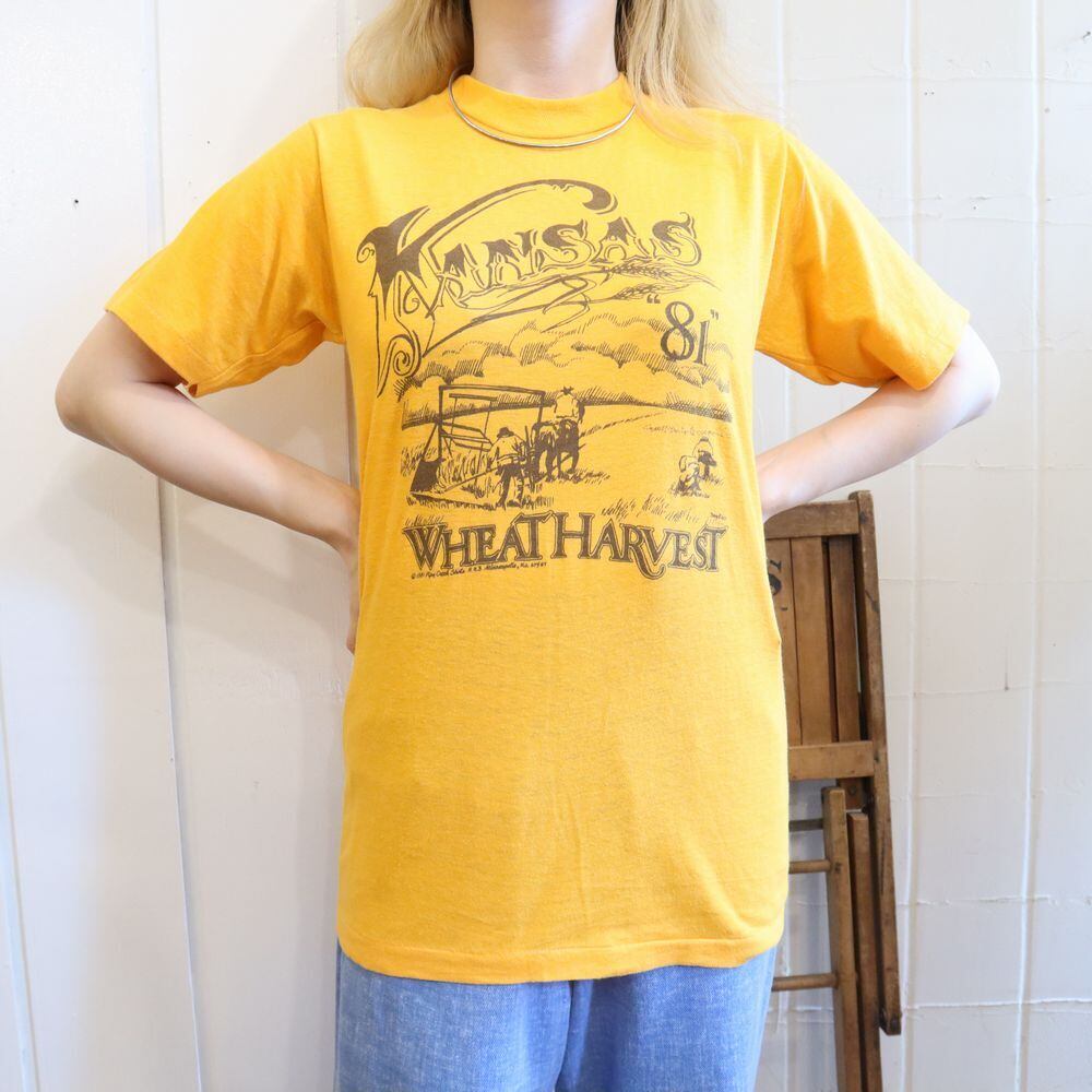 80s yellow × charcoal brown front print T-shirt [l-745]