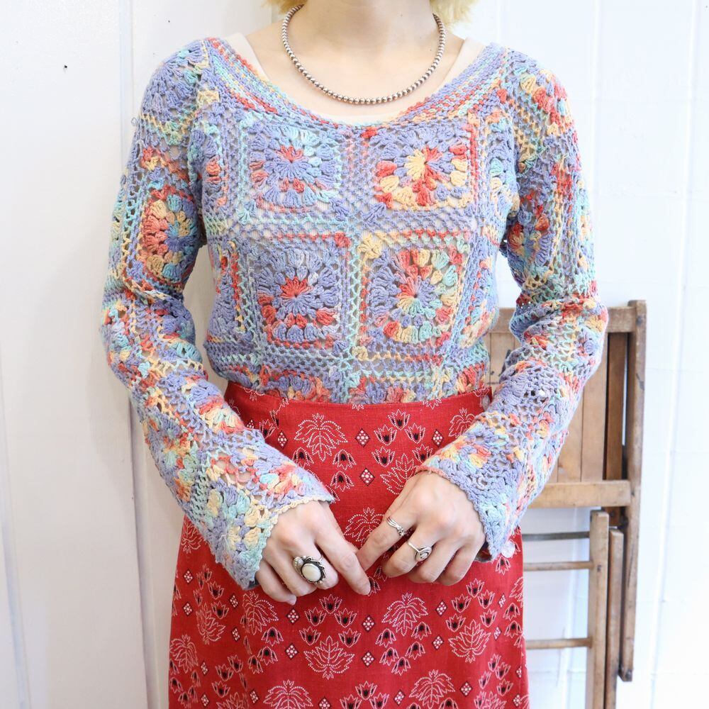 dullblue×pinkred×colorful crochet pullover tops [l-787]