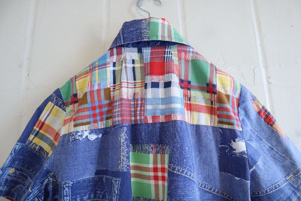 70s blue × red denim & plaid print shirt [l-830]