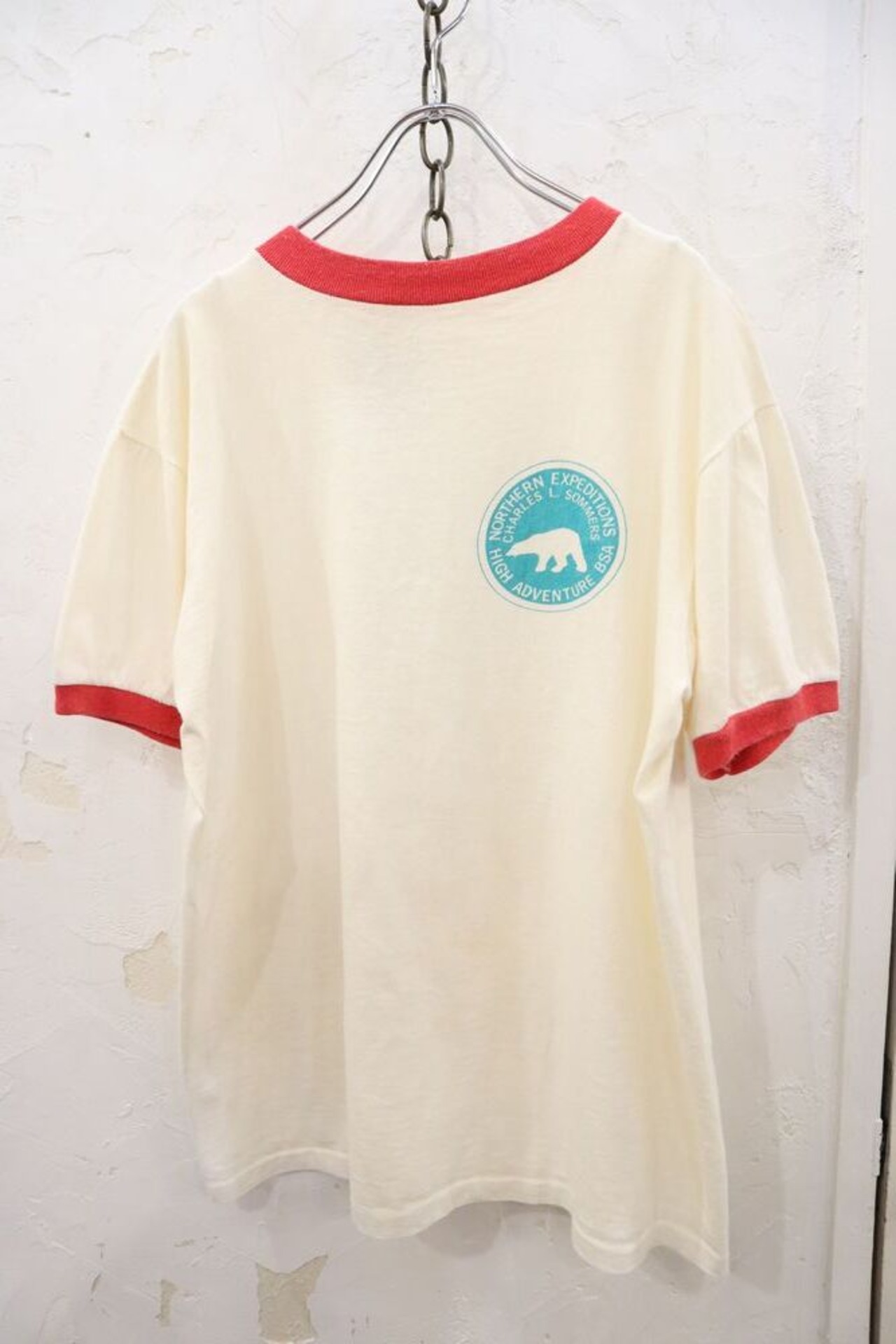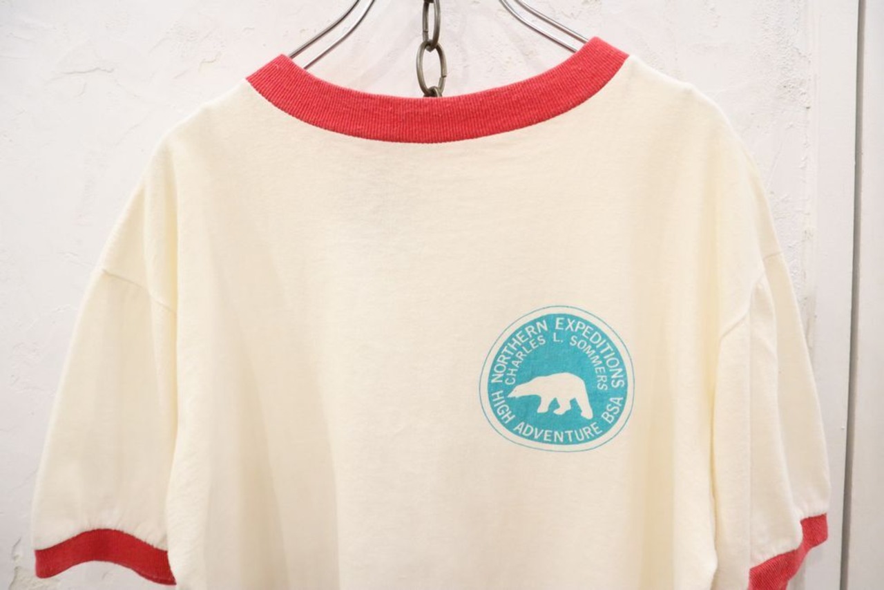 70s offwhite×red logo print ringer T-shirt [k-834]