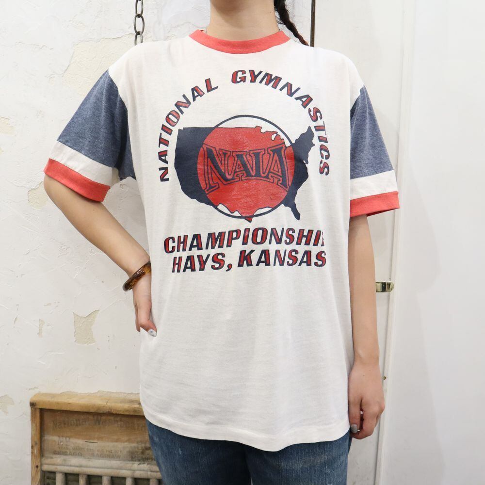 70-80s white×red×navy rubber print ringer T-shirt [k-835]