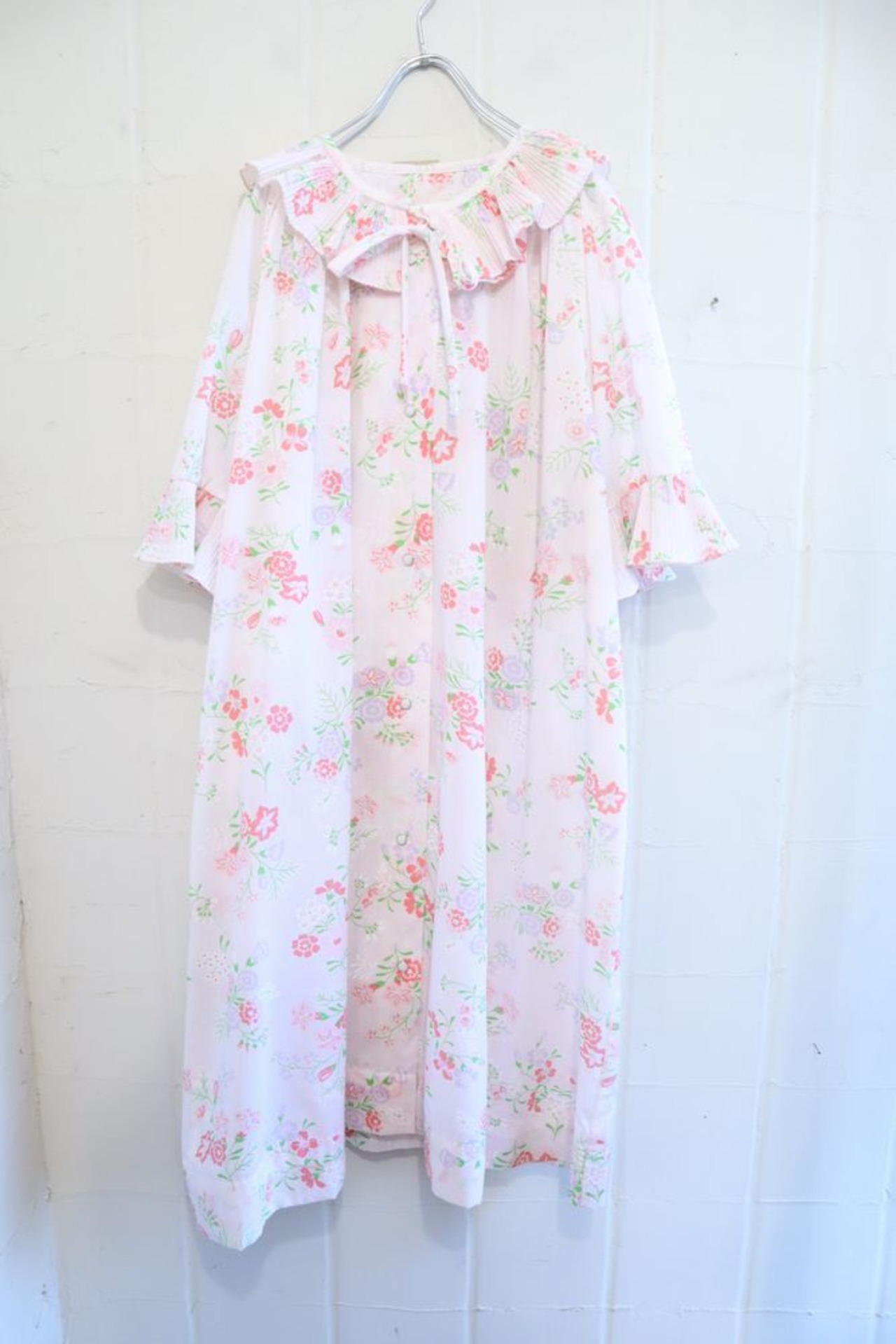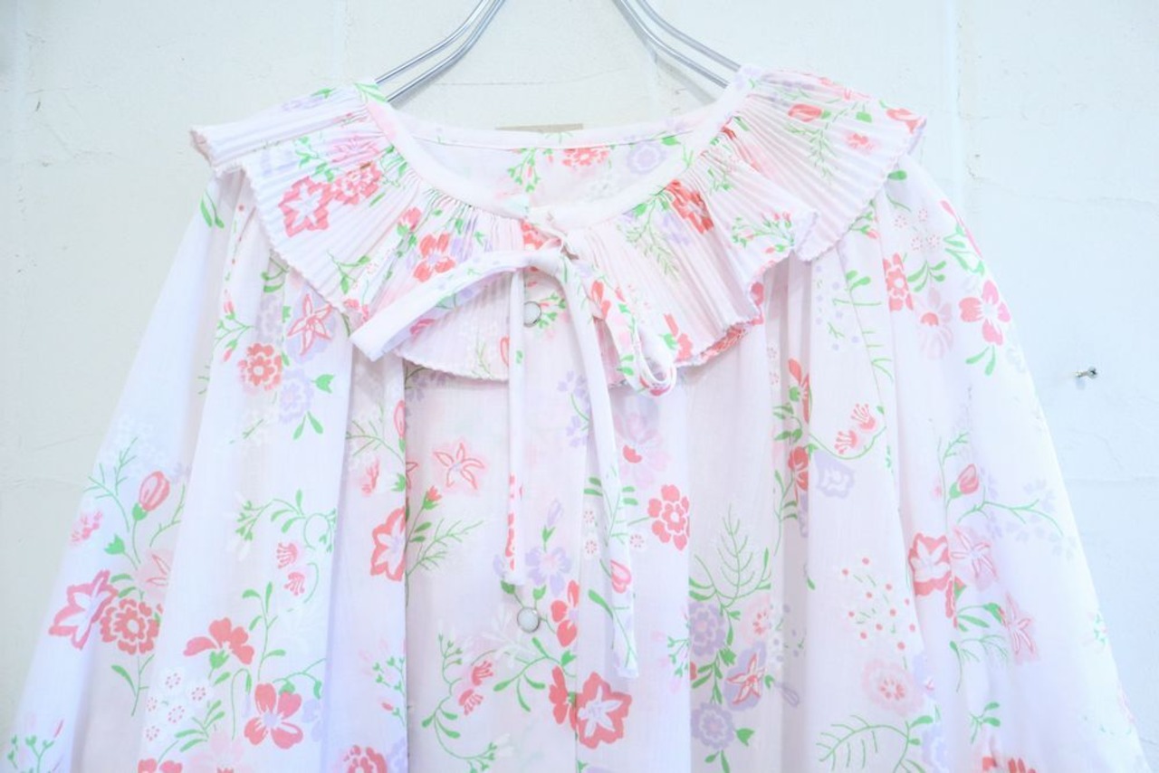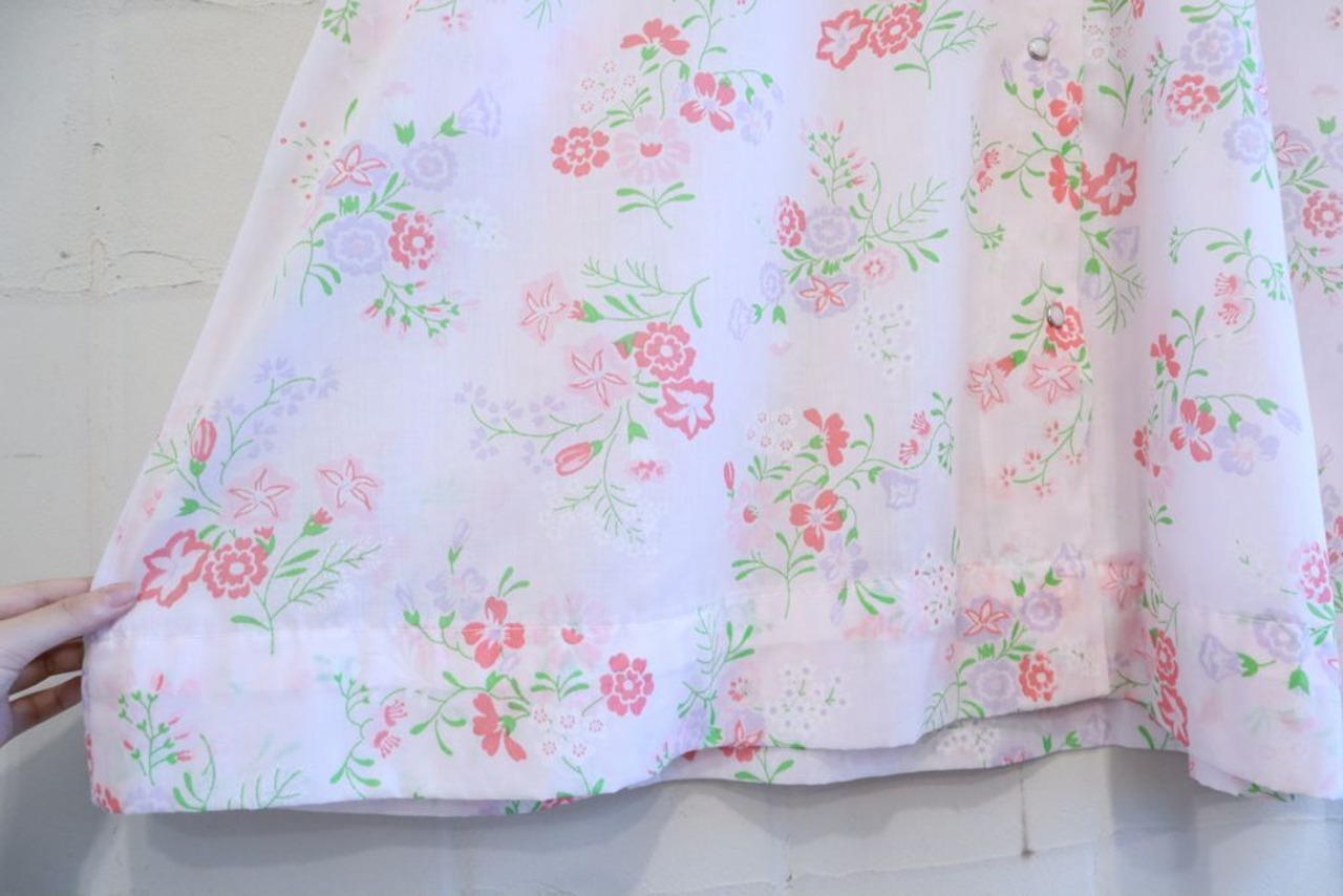 60-70s pinkwhite×pink×green flower pattern gown dress [l-848]