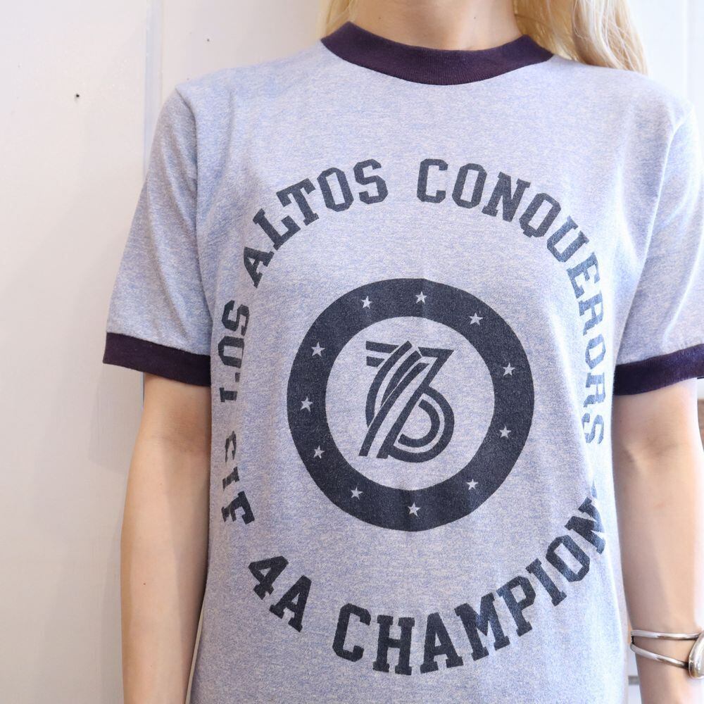 80s light blue × dark purple logo print ringer T-shirt [l-40370]