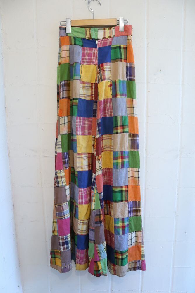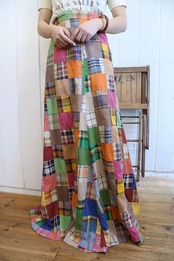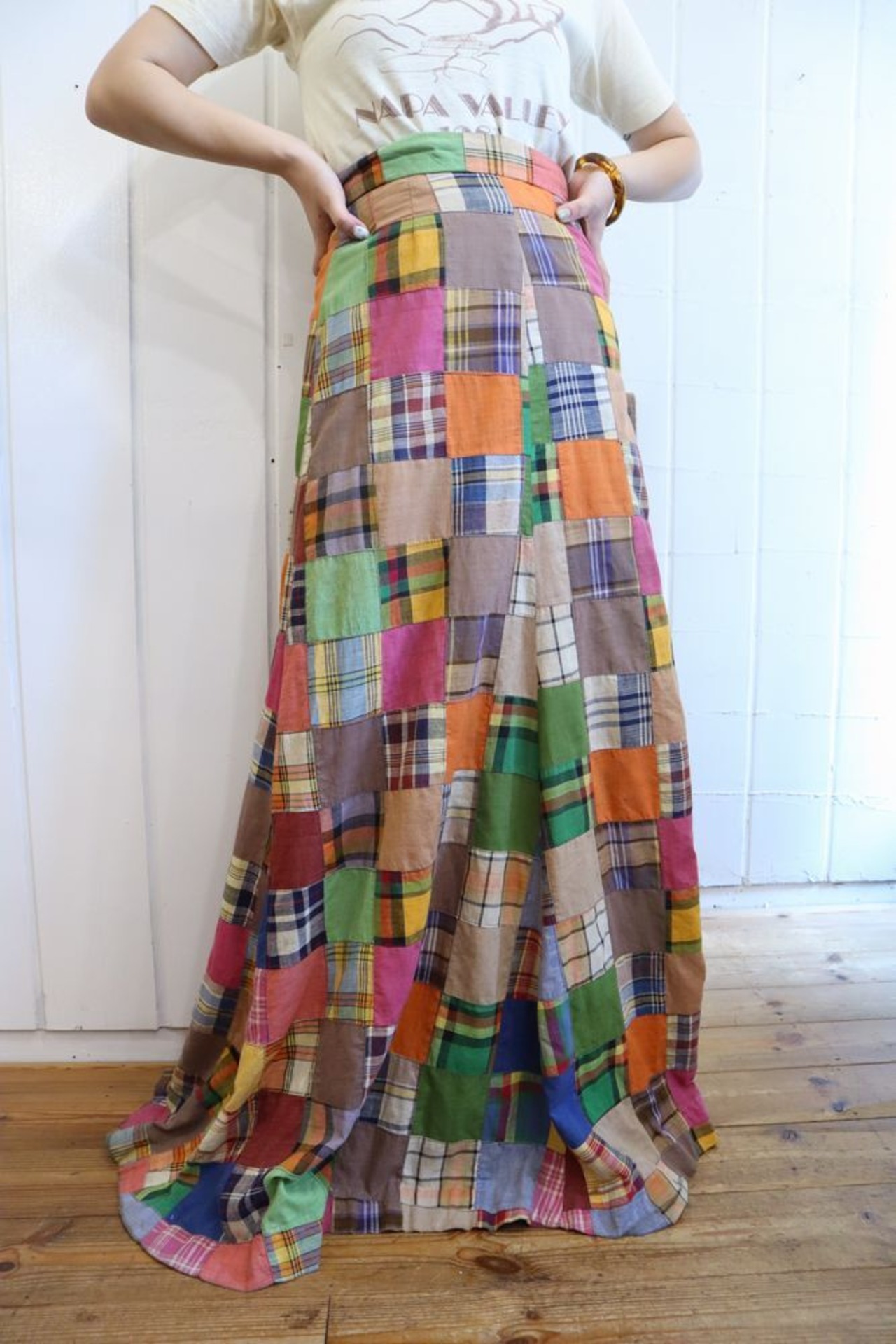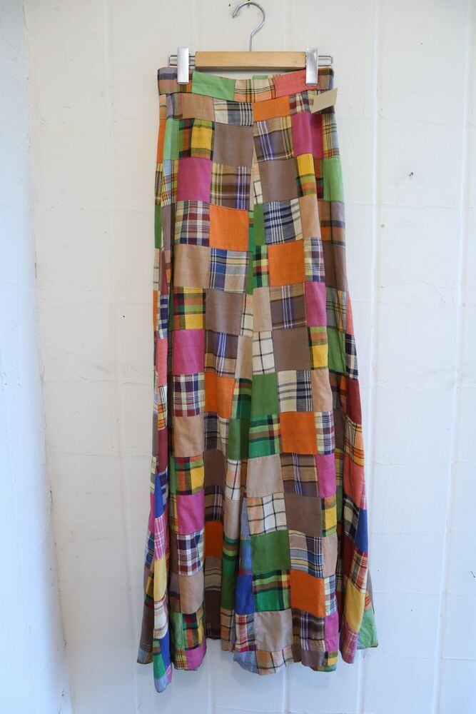 70s colorful plaid & plain patchwork long skirt [l-856]