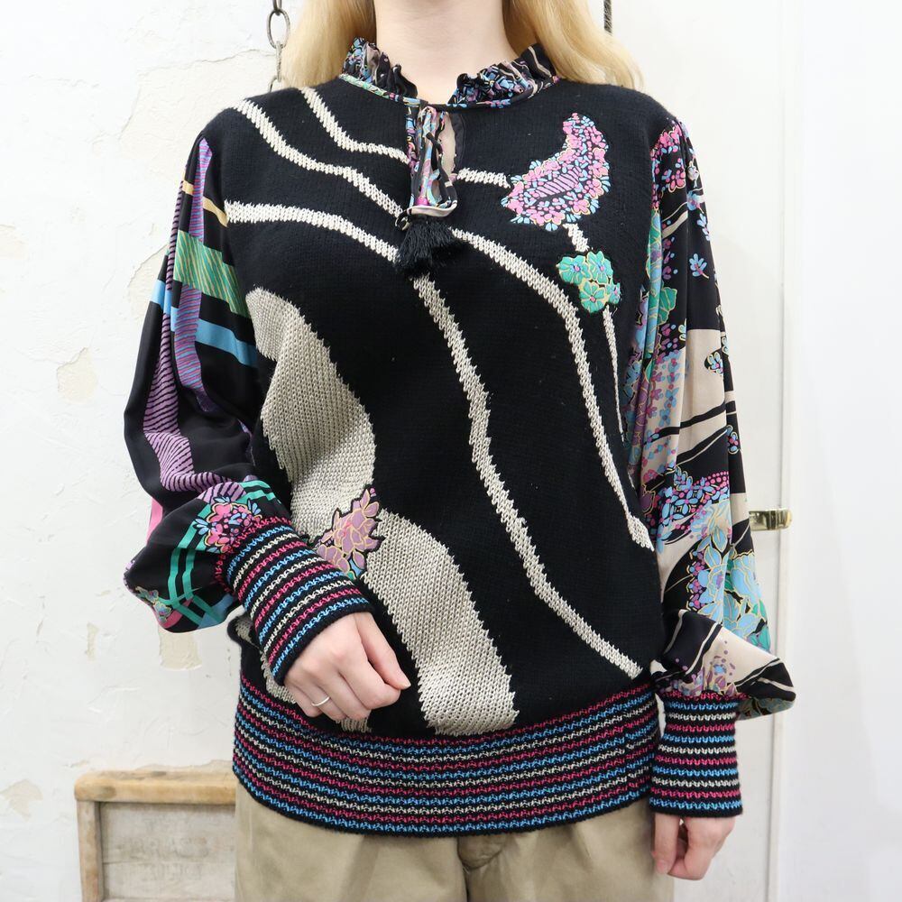 "Diane Freis" black×green×purple Knit switching long sleeve tops [k-860]