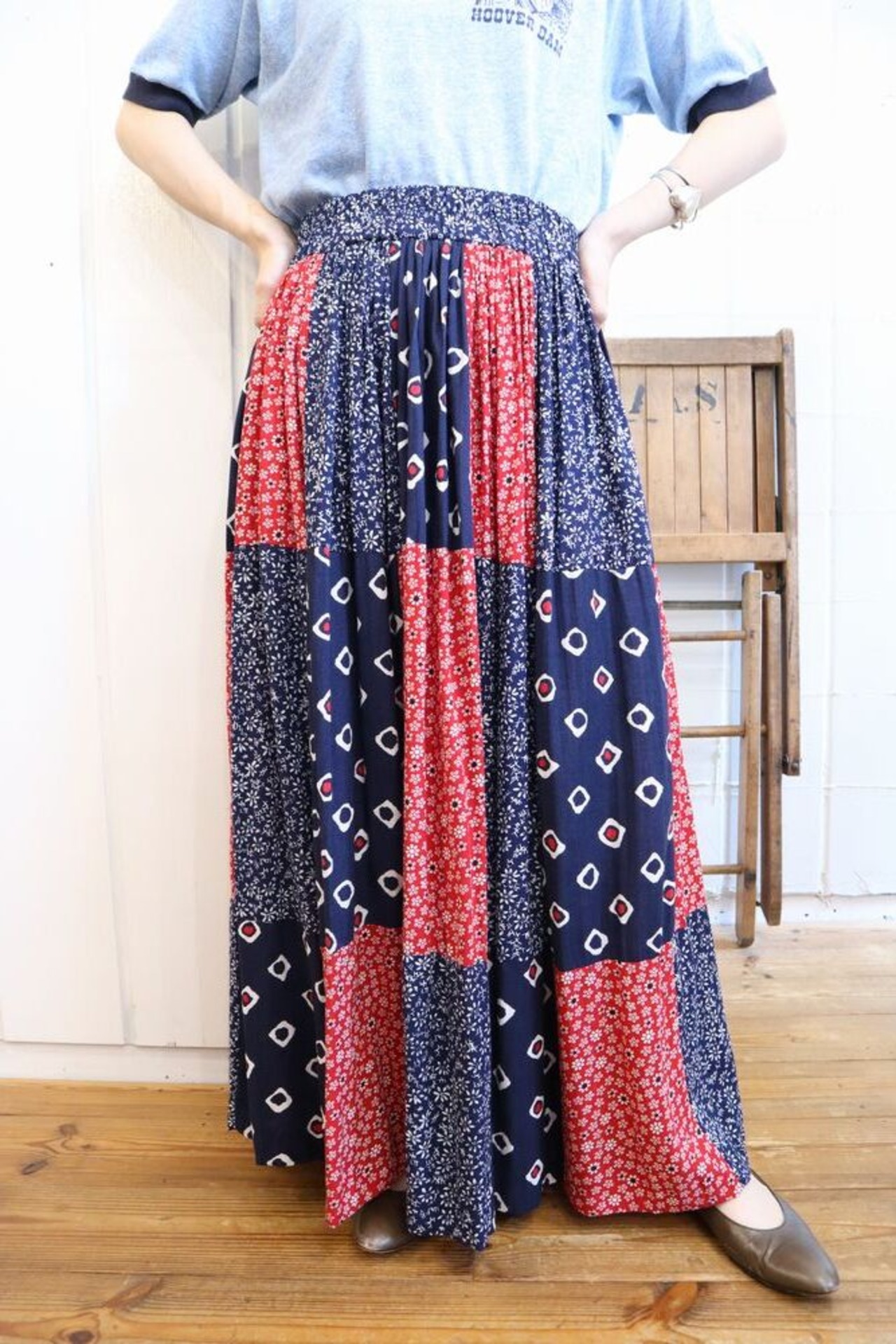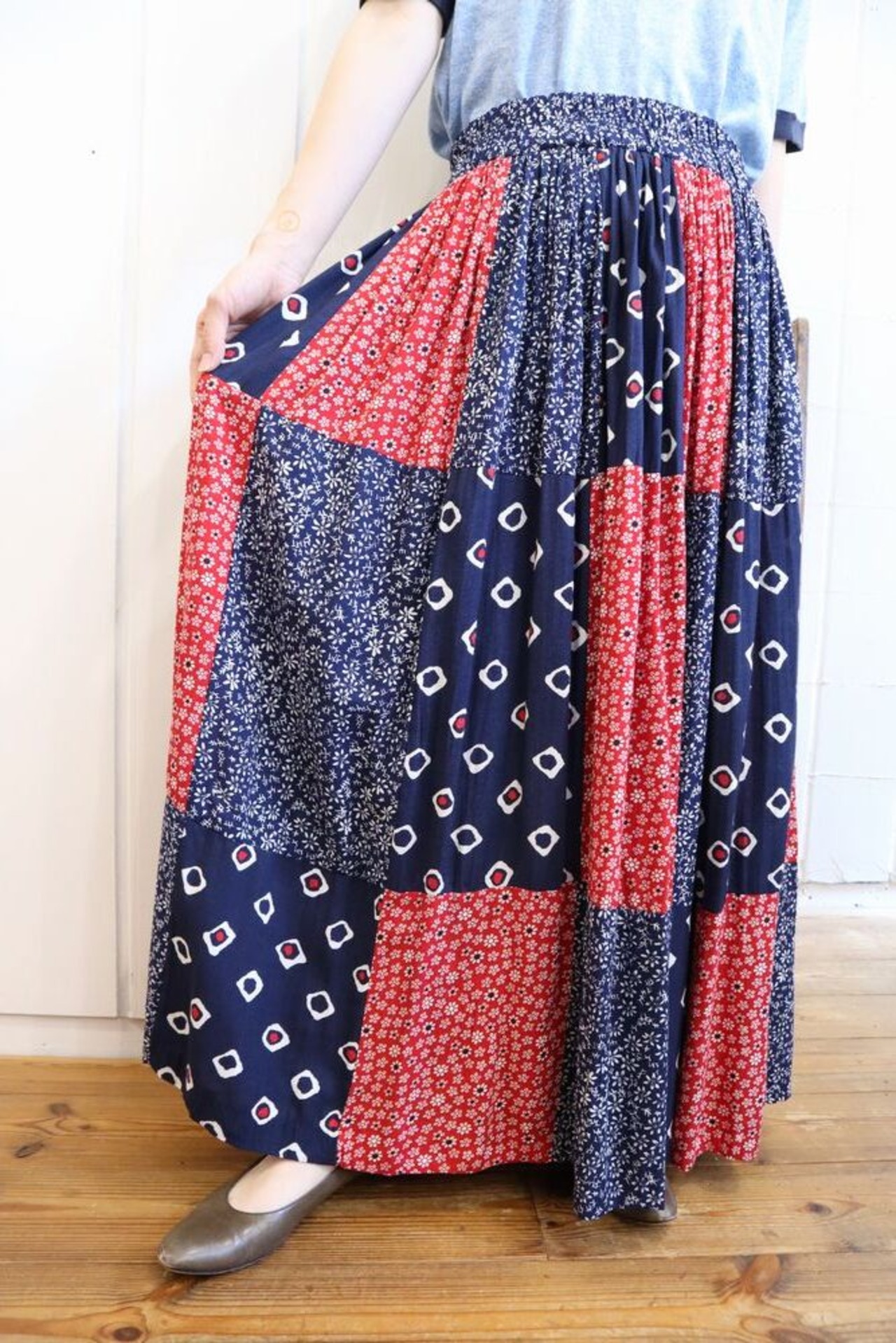 made in USA navy×red×white flower patchwork rayon skirt [l-862]